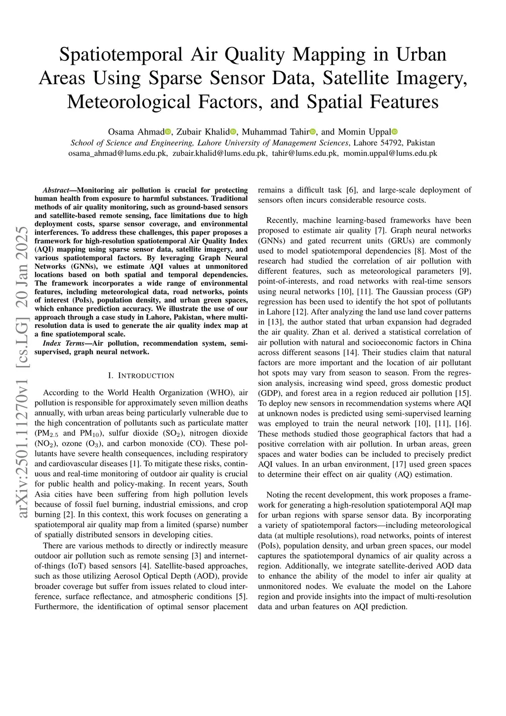 Monitoring air pollution is crucial for protecting human health from exposure to harmful substances. Traditional methods of air quality monitoring, such as ground-based sensors and satellite-based remote sensing, face limitations due to high deployment costs, sparse sensor coverage, and environmental interferences. To address these challenges, this paper proposes a framework for high-resolution spatiotemporal Air Quality Index (AQI) mapping using sparse sensor data, satellite imagery, and various spatiotemporal factors. By leveraging Graph Neural Networks (GNNs), we estimate AQI values at unmonitored locations based on both spatial and temporal dependencies. The framework incorporates a wide range of environmental features, including meteorological data, road networks, points of interest (PoIs), population density, and urban green spaces, which enhance prediction accuracy. We illustrate the use of our approach through a case study in Lahore, Pakistan, where multi-resolution data is used to generate the air quality index map at a fine spatiotemporal scale.