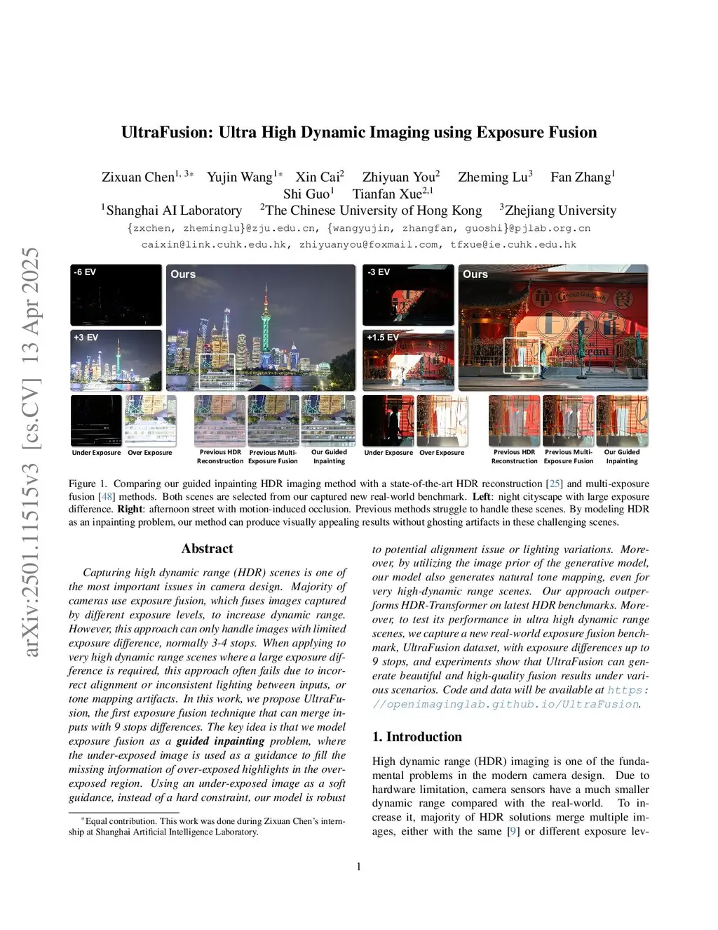 Capturing high dynamic range (HDR) scenes is one of the most important issues in camera design. Majority of cameras use exposure fusion, which fuses images captured by different exposure levels, to increase dynamic range. However, this approach can only handle images with limited exposure difference, normally 3-4 stops. When applying to very high dynamic range scenes where a large exposure difference is required, this approach often fails due to incorrect alignment or inconsistent lighting between inputs, or tone mapping artifacts. In this work, we propose \model, the first exposure fusion technique that can merge inputs with 9 stops differences. The key idea is that we model exposure fusion as a guided inpainting problem, where the under-exposed image is used as a guidance to fill the missing information of over-exposed highlights in the over-exposed region. Using an under-exposed image as a soft guidance, instead of a hard constraint, our model is robust to potential alignment issue or lighting variations. Moreover, by utilizing the image prior of the generative model, our model also generates natural tone mapping, even for very high-dynamic range scenes. Our approach outperforms HDR-Transformer on latest HDR benchmarks. Moreover, to test its performance in ultra high dynamic range scenes, we capture a new real-world exposure fusion benchmark, UltraFusion dataset, with exposure differences up to 9 stops, and experiments show that UltraFusion can generate beautiful and high-quality fusion results under various scenarios. Code and data will be available atthis https URL.