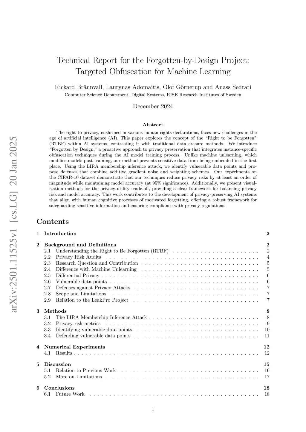 Technical Report for the Forgotten-by-Design Project: Targeted Obfuscation for Machine Learning