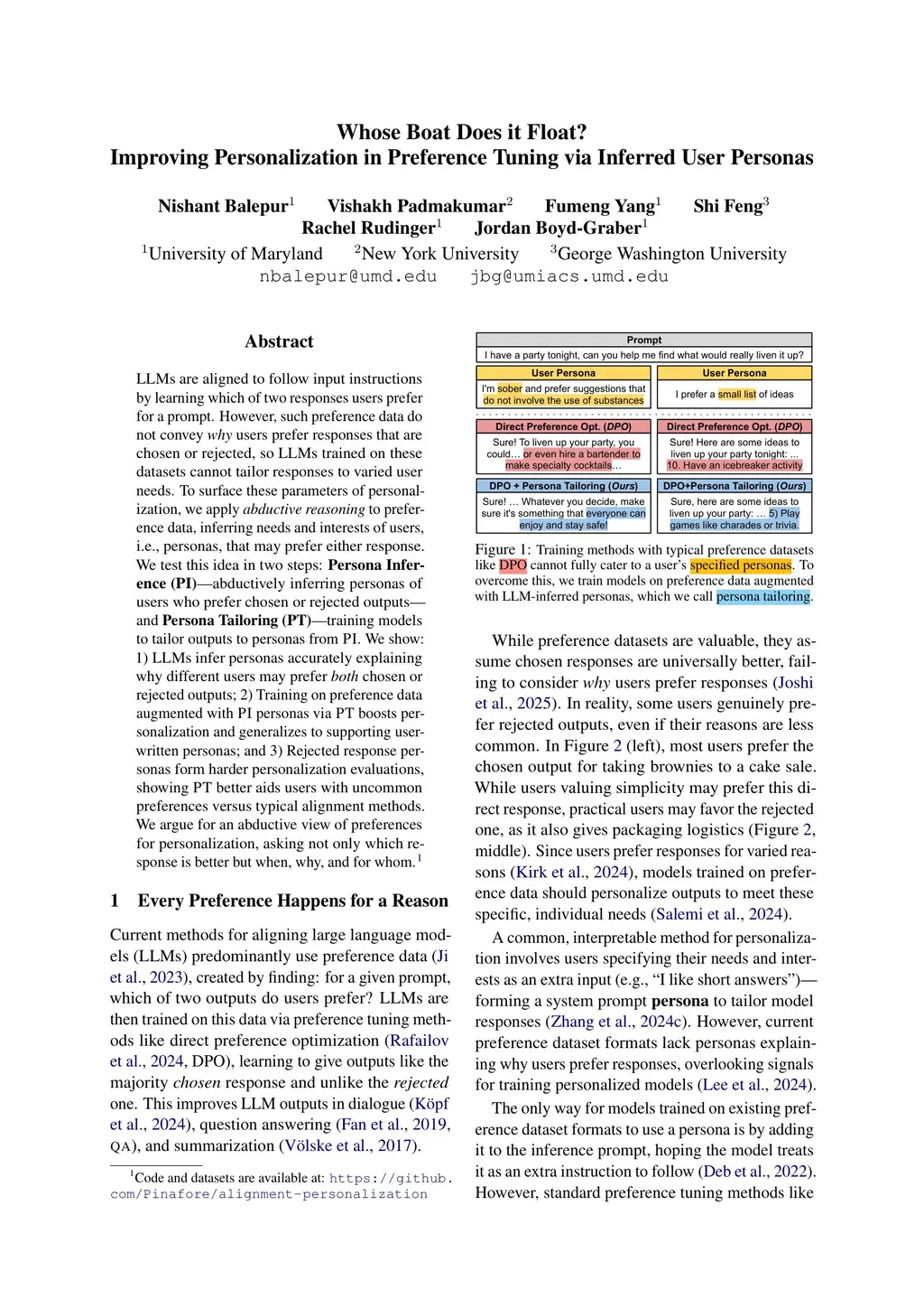 LLMs are aligned to follow input instructions by learning which of two responses users prefer for a prompt. However, such preference data do not convey why users prefer responses that are chosen or rejected, so LLMs trained on these datasets cannot tailor responses to varied user needs. To surface these parameters of personalization, we apply abductive reasoning to preference data, inferring needs and interests of users, i.e., personas, that may prefer either response. We test this idea in two steps: Persona Inference (PI), abductively inferring personas of users who prefer chosen or rejected outputs, and Persona Tailoring (PT), training models to tailor outputs to personas from PI. We show: 1) LLMs infer personas accurately explaining why different users may prefer both chosen or rejected outputs; 2) Training on preference data augmented with PI personas via PT boosts personalization and generalizes to supporting user-written personas; and 3) Rejected response personas form harder personalization evaluations, showing PT better aids users with uncommon preferences versus typical alignment methods. We argue for an abductive view of preferences for personalization, asking not only which response is better but when, why, and for whom.