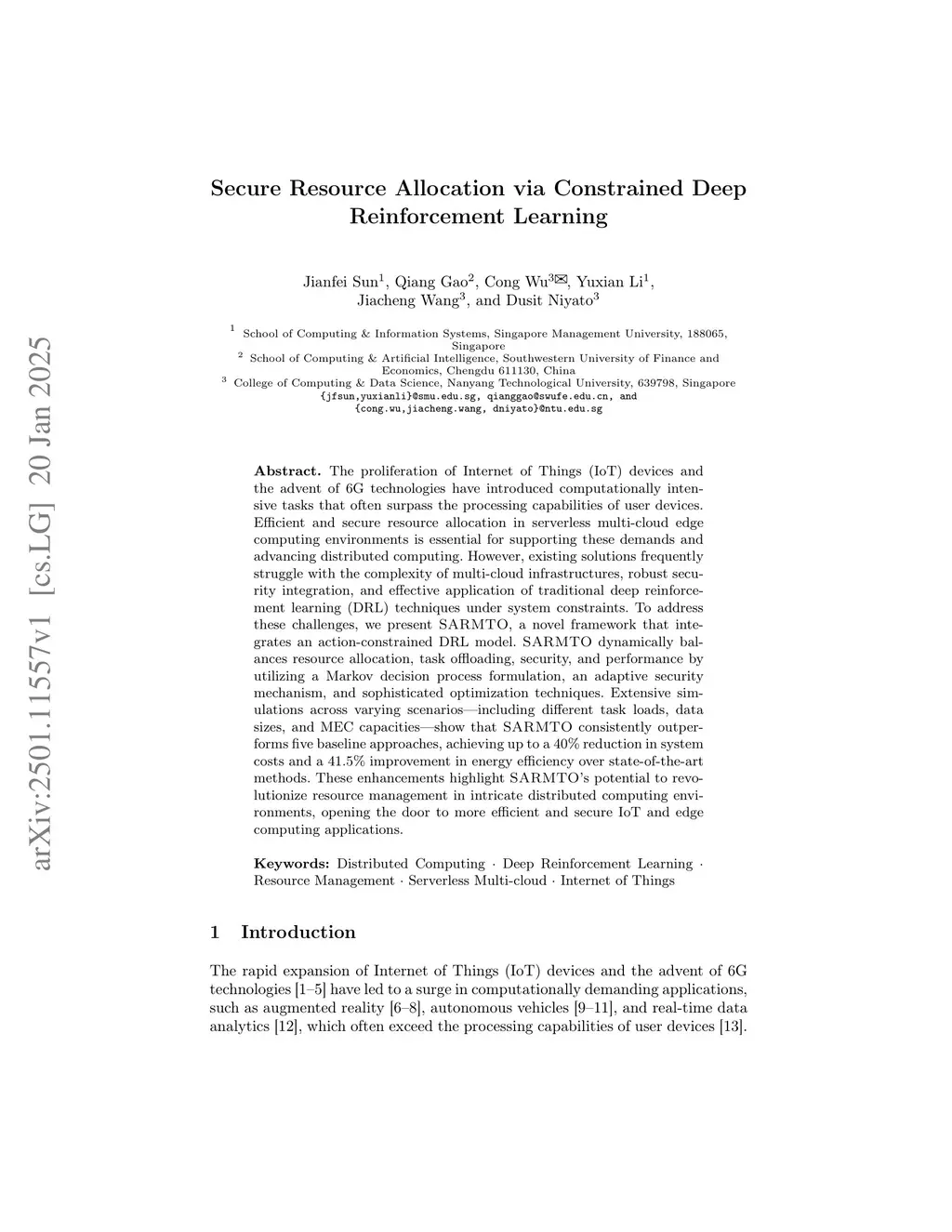 The proliferation of Internet of Things (IoT) devices and the advent of 6G technologies have introduced computationally intensive tasks that often surpass the processing capabilities of user devices. Efficient and secure resource allocation in serverless multi-cloud edge computing environments is essential for supporting these demands and advancing distributed computing. However, existing solutions frequently struggle with the complexity of multi-cloud infrastructures, robust security integration, and effective application of traditional deep reinforcement learning (DRL) techniques under system constraints. To address these challenges, we present SARMTO, a novel framework that integrates an action-constrained DRL model. SARMTO dynamically balances resource allocation, task offloading, security, and performance by utilizing a Markov decision process formulation, an adaptive security mechanism, and sophisticated optimization techniques. Extensive simulations across varying scenarios, including different task loads, data sizes, and MEC capacities, show that SARMTO consistently outperforms five baseline approaches, achieving up to a 40% reduction in system costs and a 41.5% improvement in energy efficiency over state-of-the-art methods. These enhancements highlight SARMTO's potential to revolutionize resource management in intricate distributed computing environments, opening the door to more efficient and secure IoT and edge computing applications.