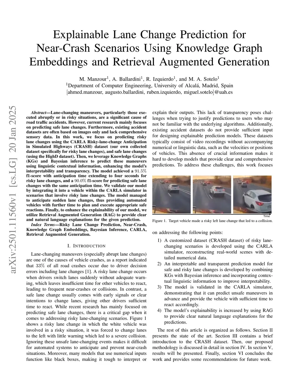 Lane-changing maneuvers, particularly those executed abruptly or in risky situations, are a significant cause of road traffic accidents. However, current research mainly focuses on predicting safe lane changes. Furthermore, existing accident datasets are often based on images only and lack comprehensive sensory data. In this work, we focus on predicting risky lane changes using the CRASH dataset (our own collected dataset specifically for risky lane changes), and safe lane changes (using the HighD dataset). Then, we leverage KG and Bayesian inference to predict these maneuvers using linguistic contextual information, enhancing the model's interpretability and transparency. The model achieved a 91.5% f1-score with anticipation time extending to four seconds for risky lane changes, and a 90.0% f1-score for predicting safe lane changes with the same anticipation time. We validate our model by integrating it into a vehicle within the CARLA simulator in scenarios that involve risky lane changes. The model managed to anticipate sudden lane changes, thus providing automated vehicles with further time to plan and execute appropriate safe reactions. Finally, to enhance the explainability of our model, we utilize RAG to provide clear and natural language explanations for the given prediction.