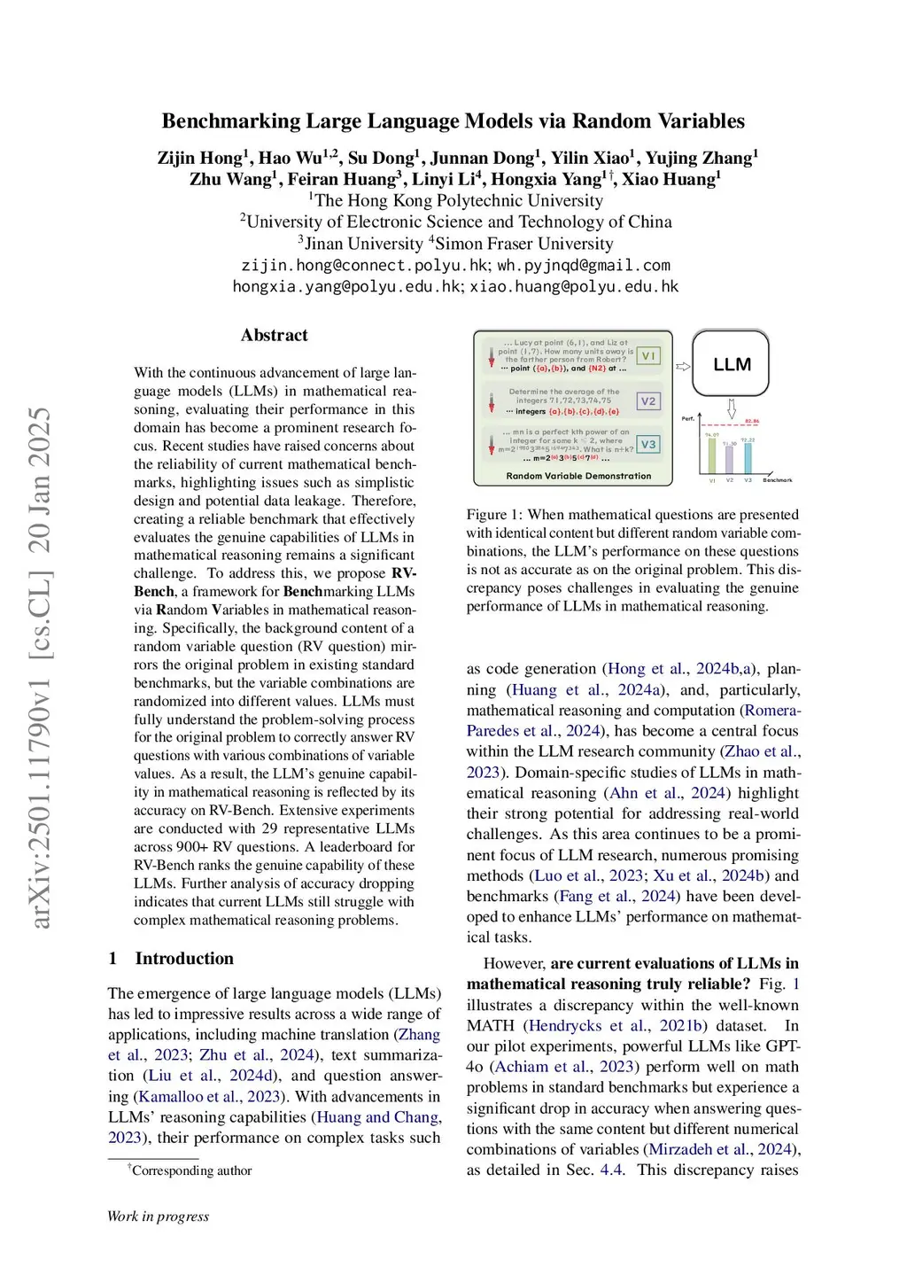 Recent studies have raised significant concerns regarding the reliability of current mathematics benchmarks, highlighting issues such as simplistic design and potential data contamination. Consequently, developing a reliable benchmark that effectively evaluates large language models' (LLMs) genuine capabilities in mathematical reasoning remains a critical challenge. To address these concerns, we propose RV-Bench, a novel evaluation methodology for Benchmarking LLMs with Random Variables in mathematical reasoning. Specifically, we build question-generating functions to produce random variable questions (RVQs), whose background content mirrors original benchmark problems, but with randomized variable combinations, rendering them "unseen" to LLMs. Models must completely understand the inherent question pattern to correctly answer RVQs with diverse variable combinations. Thus, an LLM's genuine reasoning capability is reflected through its accuracy and robustness on RV-Bench. We conducted extensive experiments on over 30 representative LLMs across more than 1,000 RVQs. Our findings propose that LLMs exhibit a proficiency imbalance between encountered and ``unseen'' data distributions. Furthermore, RV-Bench reveals that proficiency generalization across similar mathematical reasoning tasks is limited, but we verified it can still be effectively elicited through test-time scaling.