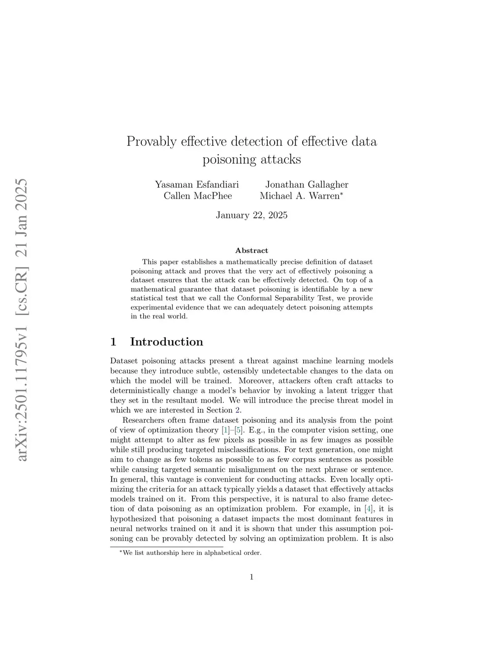 This paper establishes a mathematically precise definition of dataset poisoning attack and proves that the very act of effectively poisoning a dataset ensures that the attack can be effectively detected. On top of a mathematical guarantee that dataset poisoning is identifiable by a new statistical test that we call the Conformal Separability Test, we provide experimental evidence that we can adequately detect poisoning attempts in the real world.