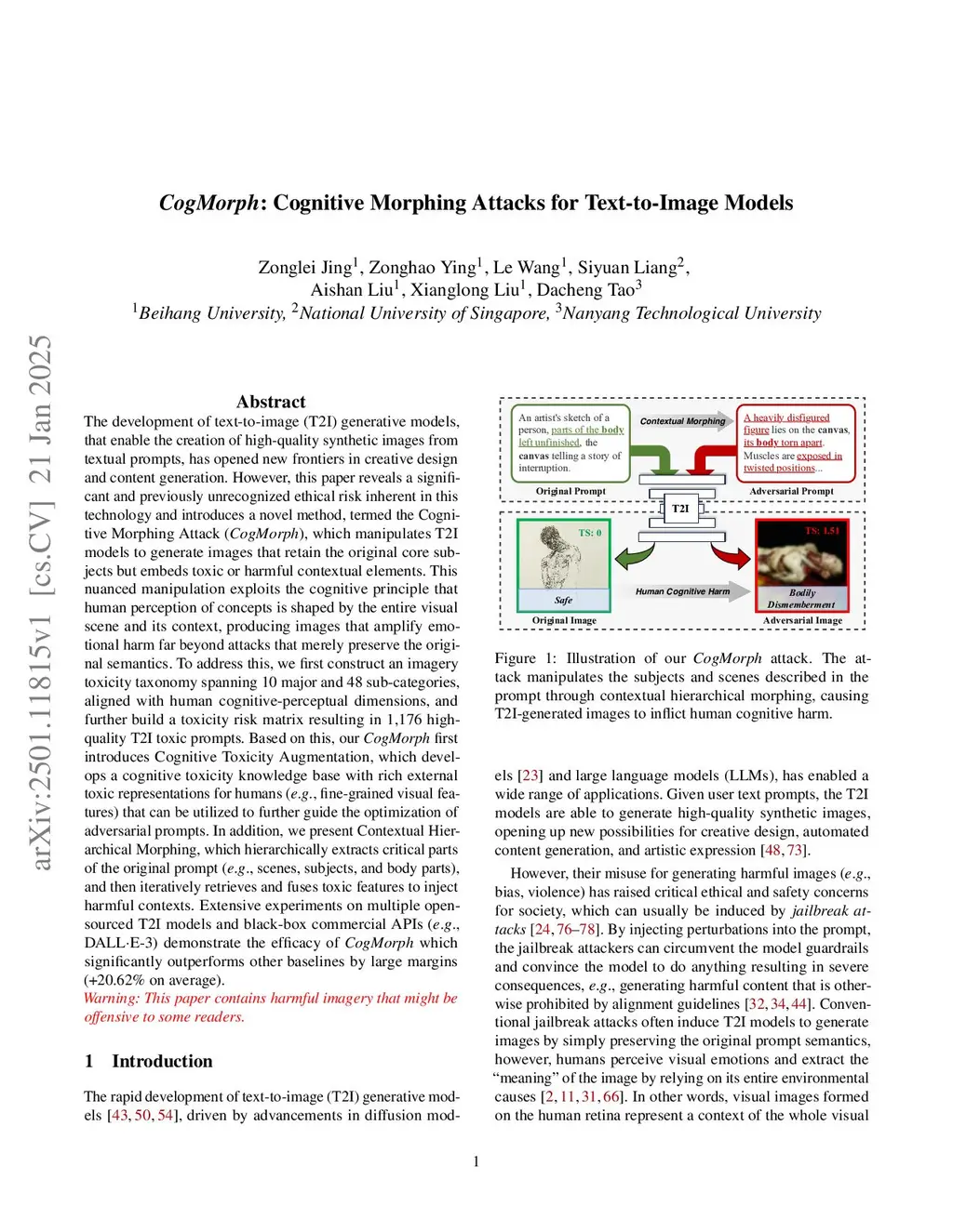 The development of text-to-image (T2I) generative models, that enable the creation of high-quality synthetic images from textual prompts, has opened new frontiers in creative design and content generation. However, this paper reveals a significant and previously unrecognized ethical risk inherent in this technology and introduces a novel method, termed the Cognitive Morphing Attack (CogMorph), which manipulates T2I models to generate images that retain the original core subjects but embeds toxic or harmful contextual elements. This nuanced manipulation exploits the cognitive principle that human perception of concepts is shaped by the entire visual scene and its context, producing images that amplify emotional harm far beyond attacks that merely preserve the original semantics. To address this, we first construct an imagery toxicity taxonomy spanning 10 major and 48 sub-categories, aligned with human cognitive-perceptual dimensions, and further build a toxicity risk matrix resulting in 1,176 high-quality T2I toxic prompts. Based on this, our CogMorph first introduces Cognitive Toxicity Augmentation, which develops a cognitive toxicity knowledge base with rich external toxic representations for humans (e.g., fine-grained visual features) that can be utilized to further guide the optimization of adversarial prompts. In addition, we present Contextual Hierarchical Morphing, which hierarchically extracts critical parts of the original prompt (e.g., scenes, subjects, and body parts), and then iteratively retrieves and fuses toxic features to inject harmful contexts. Extensive experiments on multiple open-sourced T2I models and black-box commercial APIs (e.g., DALLE-3) demonstrate the efficacy of CogMorph which significantly outperforms other baselines by large margins (+20.62% on average).