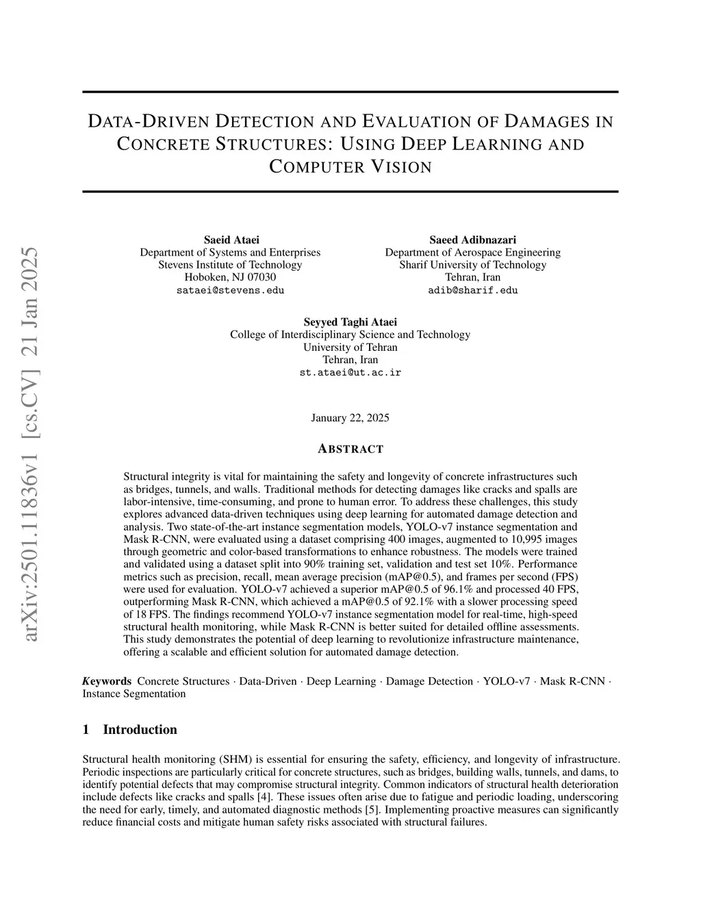 Structural integrity is vital for maintaining the safety and longevity of concrete infrastructures such as bridges, tunnels, and walls. Traditional methods for detecting damages like cracks and spalls are labor-intensive, time-consuming, and prone to human error. To address these challenges, this study explores advanced data-driven techniques using deep learning for automated damage detection and analysis. Two state-of-the-art instance segmentation models, YOLO-v7 instance segmentation and Mask R-CNN, were evaluated using a dataset comprising 400 images, augmented to 10,995 images through geometric and color-based transformations to enhance robustness. The models were trained and validated using a dataset split into 90% training set, validation and test set 10%. Performance metrics such as precision, recall, mean average precision (mAP@0.5), and frames per second (FPS) were used for evaluation. YOLO-v7 achieved a superior mAP@0.5 of 96.1% and processed 40 FPS, outperforming Mask R-CNN, which achieved a mAP@0.5 of 92.1% with a slower processing speed of 18 FPS. The findings recommend YOLO-v7 instance segmentation model for real-time, high-speed structural health monitoring, while Mask R-CNN is better suited for detailed offline assessments. This study demonstrates the potential of deep learning to revolutionize infrastructure maintenance, offering a scalable and efficient solution for automated damage detection.