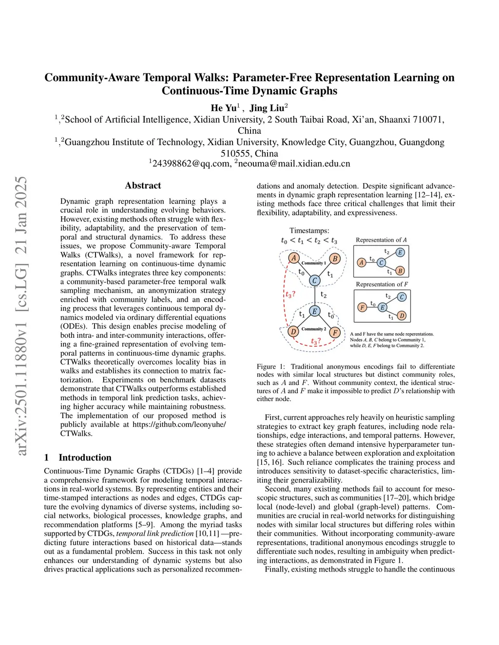 Community-Aware Temporal Walks: Parameter-Free Representation Learning on Continuous-Time Dynamic Graphs
