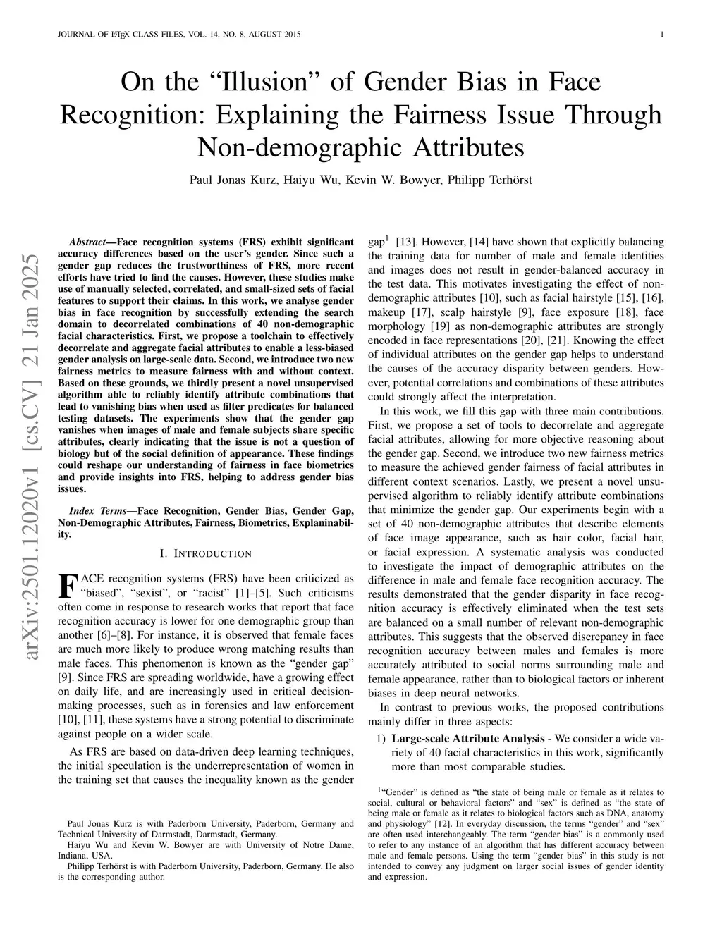Face recognition systems (FRS) exhibit significant accuracy differences based on the user's gender. Since such a gender gap reduces the trustworthiness of FRS, more recent efforts have tried to find the causes. However, these studies make use of manually selected, correlated, and small-sized sets of facial features to support their claims. In this work, we analyse gender bias in face recognition by successfully extending the search domain to decorrelated combinations of 40 non-demographic facial characteristics. First, we propose a toolchain to effectively decorrelate and aggregate facial attributes to enable a less-biased gender analysis on large-scale data. Second, we introduce two new fairness metrics to measure fairness with and without context. Based on these grounds, we thirdly present a novel unsupervised algorithm able to reliably identify attribute combinations that lead to vanishing bias when used as filter predicates for balanced testing datasets. The experiments show that the gender gap vanishes when images of male and female subjects share specific attributes, clearly indicating that the issue is not a question of biology but of the social definition of appearance. These findings could reshape our understanding of fairness in face biometrics and provide insights into FRS, helping to address gender bias issues.