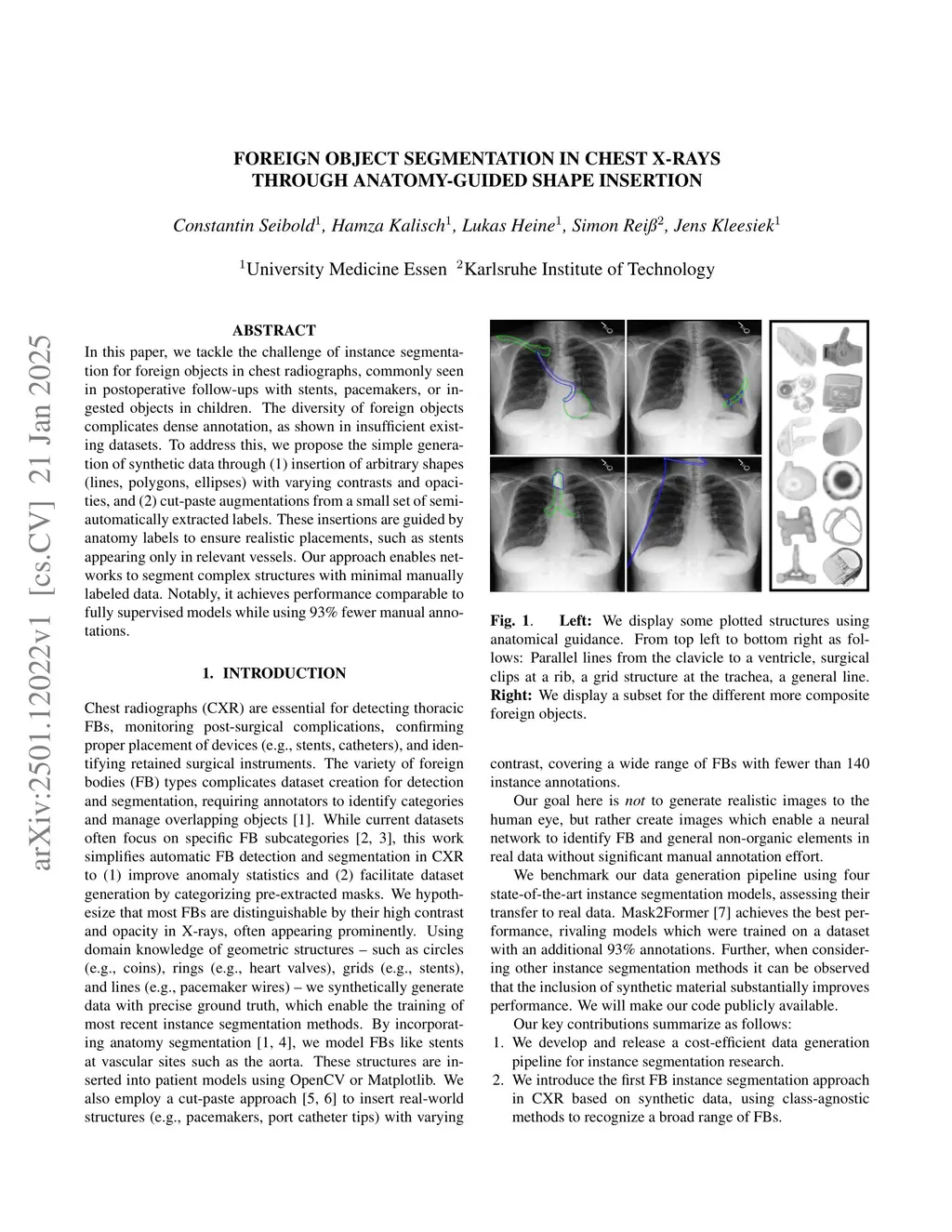 Foreign object segmentation in chest x-rays through anatomy-guided shape insertion