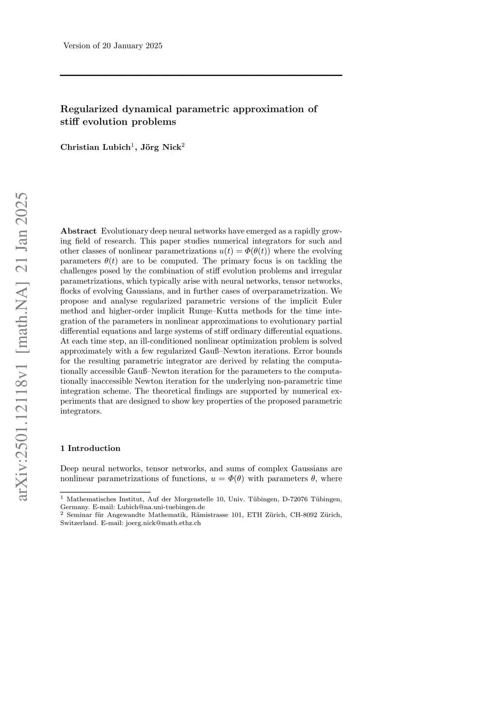 Evolutionary deep neural networks have emerged as a rapidly growing field of research. This paper studies numerical integrators for such and other classes of nonlinear parametrizations $ u(t) = \Phi(\theta(t)) $, where the evolving parameters are to be computed. The primary focus is on tackling the challenges posed by the combination of stiff evolution problems and irregular parametrizations, which typically arise with neural networks, tensor networks, flocks of evolving Gaussians, and in further cases of overparametrization. We propose and analyse regularized parametric versions of the implicit Euler method and higher-order implicit Runge--Kutta methods for the time integration of the parameters in nonlinear approximations to evolutionary partial differential equations and large systems of stiff ordinary differential equations. At each time step, an ill-conditioned nonlinear optimization problem is solved approximately with a few regularized Gauss--Newton iterations. Error bounds for the resulting parametric integrator are derived by relating the computationally accessible Gauss--Newton iteration for the parameters to the computationally inaccessible Newton iteration for the underlying non-parametric time integration scheme. The theoretical findings are supported by numerical experiments that are designed to show key properties of the proposed parametric integrators.