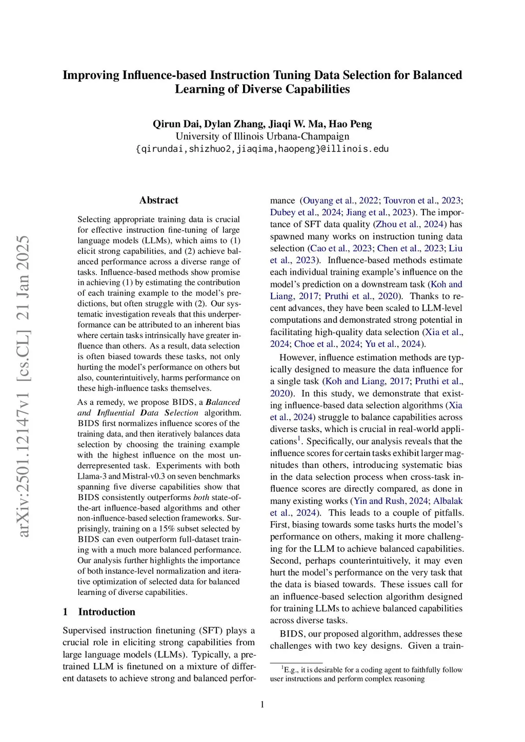 Selecting appropriate training data is crucial for effective instruction fine-tuning of large language models (LLMs), which aims to (1) elicit strong capabilities, and (2) achieve balanced performance across a diverse range of tasks. Influence-based methods show promise in achieving (1) by estimating the contribution of each training example to the model's predictions, but often struggle with (2). Our systematic investigation reveals that this underperformance can be attributed to an inherent bias where certain tasks intrinsically have greater influence than others. As a result, data selection is often biased towards these tasks, not only hurting the model's performance on others but also, counterintuitively, harms performance on these high-influence tasks themselves.As a remedy, we propose BIDS, a Balanced and Influential Data Selection algorithm. BIDS first normalizes influence scores of the training data, and then iteratively balances data selection by choosing the training example with the highest influence on the most underrepresented task. Experiments with both Llama-3 and Mistral-v0.3 on seven benchmarks spanning five diverse capabilities show that BIDS consistently outperforms both state-of-the-art influence-based algorithms and other non-influence-based selection frameworks. Surprisingly, training on a 15% subset selected by BIDS can even outperform full-dataset training with a much more balanced performance. Our analysis further highlights the importance of both instance-level normalization and iterative optimization of selected data for balanced learning of diverse capabilities.