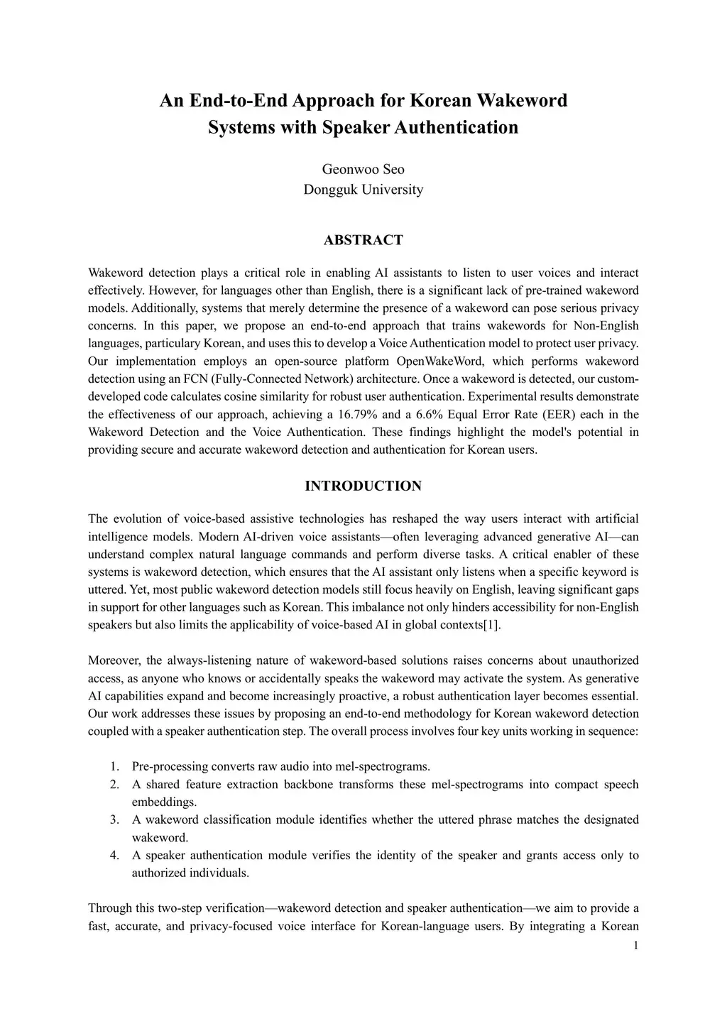 Wakeword detection plays a critical role in enabling AI assistants to listen to user voices and interact effectively. However, for languages other than English, there is a significant lack of pre-trained wakeword models. Additionally, systems that merely determine the presence of a wakeword can pose serious privacy concerns. In this paper, we propose an end-to-end approach that trains wakewords for Non-English languages, particulary Korean, and uses this to develop a Voice Authentication model to protect user privacy. Our implementation employs an open-source platform OpenWakeWord, which performs wakeword detection using an FCN (Fully-Connected Network) architecture. Once a wakeword is detected, our custom-developed code calculates cosine similarity for robust user authentication. Experimental results demonstrate the effectiveness of our approach, achieving a 16.79% and a 6.6% Equal Error Rate (EER) each in the Wakeword Detection and the Voice Authentication. These findings highlight the model's potential in providing secure and accurate wakeword detection and authentication for Korean users.