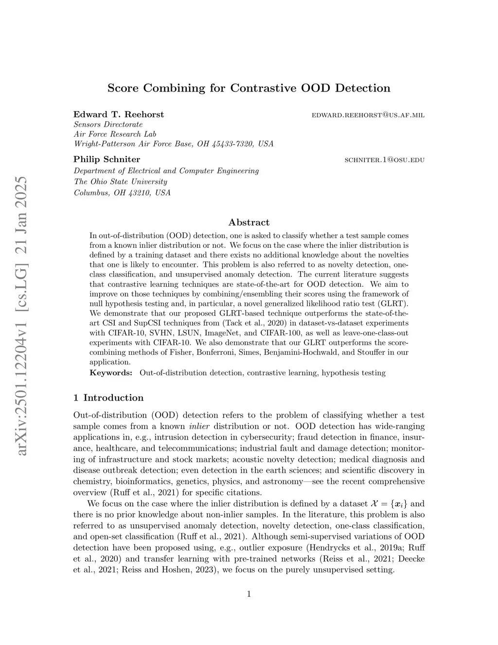 In out-of-distribution (OOD) detection, one is asked to classify whether a test sample comes from a known inlier distribution or not. We focus on the case where the inlier distribution is defined by a training dataset and there exists no additional knowledge about the novelties that one is likely to encounter. This problem is also referred to as novelty detection, one-class classification, and unsupervised anomaly detection. The current literature suggests that contrastive learning techniques are state-of-the-art for OOD detection. We aim to improve on those techniques by combining/ensembling their scores using the framework of null hypothesis testing and, in particular, a novel generalized likelihood ratio test (GLRT). We demonstrate that our proposed GLRT-based technique outperforms the state-of-the-art CSI and SupCSI techniques from Tack et al. 2020 in dataset-vs-dataset experiments with CIFAR-10, SVHN, LSUN, ImageNet, and CIFAR-100, as well as leave-one-class-out experiments with CIFAR-10. We also demonstrate that our GLRT outperforms the score-combining methods of Fisher, Bonferroni, Simes, Benjamini-Hochwald, and Stouffer in our application.