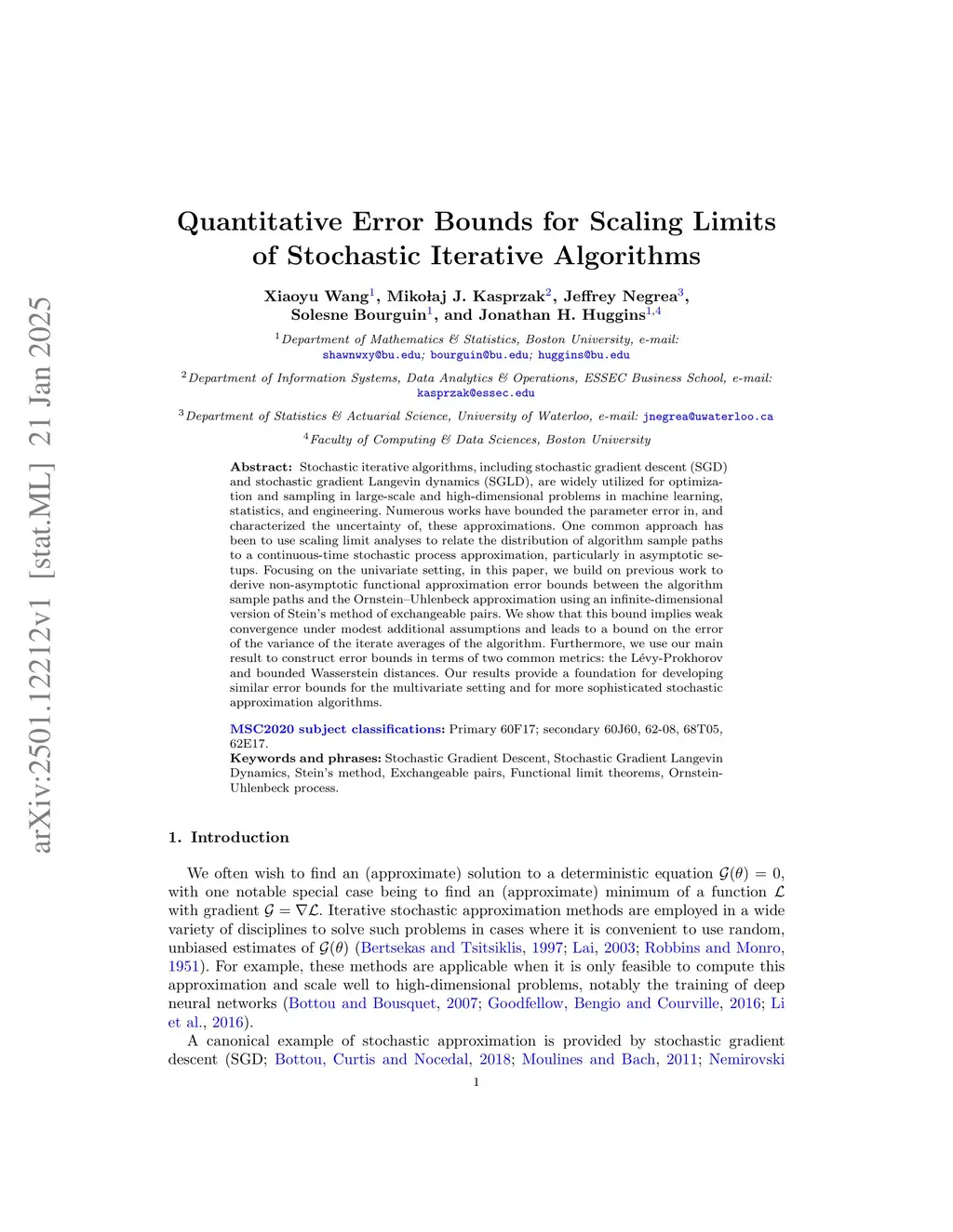 Stochastic iterative algorithms, including stochastic gradient descent (SGD) and stochastic gradient Langevin dynamics (SGLD), are widely utilized for optimization and sampling in large-scale and high-dimensional problems in machine learning, statistics, and engineering. Numerous works have bounded the parameter error in, and characterized the uncertainty of, these approximations. One common approach has been to use scaling limit analyses to relate the distribution of algorithm sample paths to a continuous-time stochastic process approximation, particularly in asymptotic setups. Focusing on the univariate setting, in this paper, we build on previous work to derive non-asymptotic functional approximation error bounds between the algorithm sample paths and the Ornstein-Uhlenbeck approximation using an infinite-dimensional version of Stein's method of exchangeable pairs. We show that this bound implies weak convergence under modest additional assumptions and leads to a bound on the error of the variance of the iterate averages of the algorithm. Furthermore, we use our main result to construct error bounds in terms of two common metrics: the Lévy-Prokhorov and bounded Wasserstein distances. Our results provide a foundation for developing similar error bounds for the multivariate setting and for more sophisticated stochastic approximation algorithms.