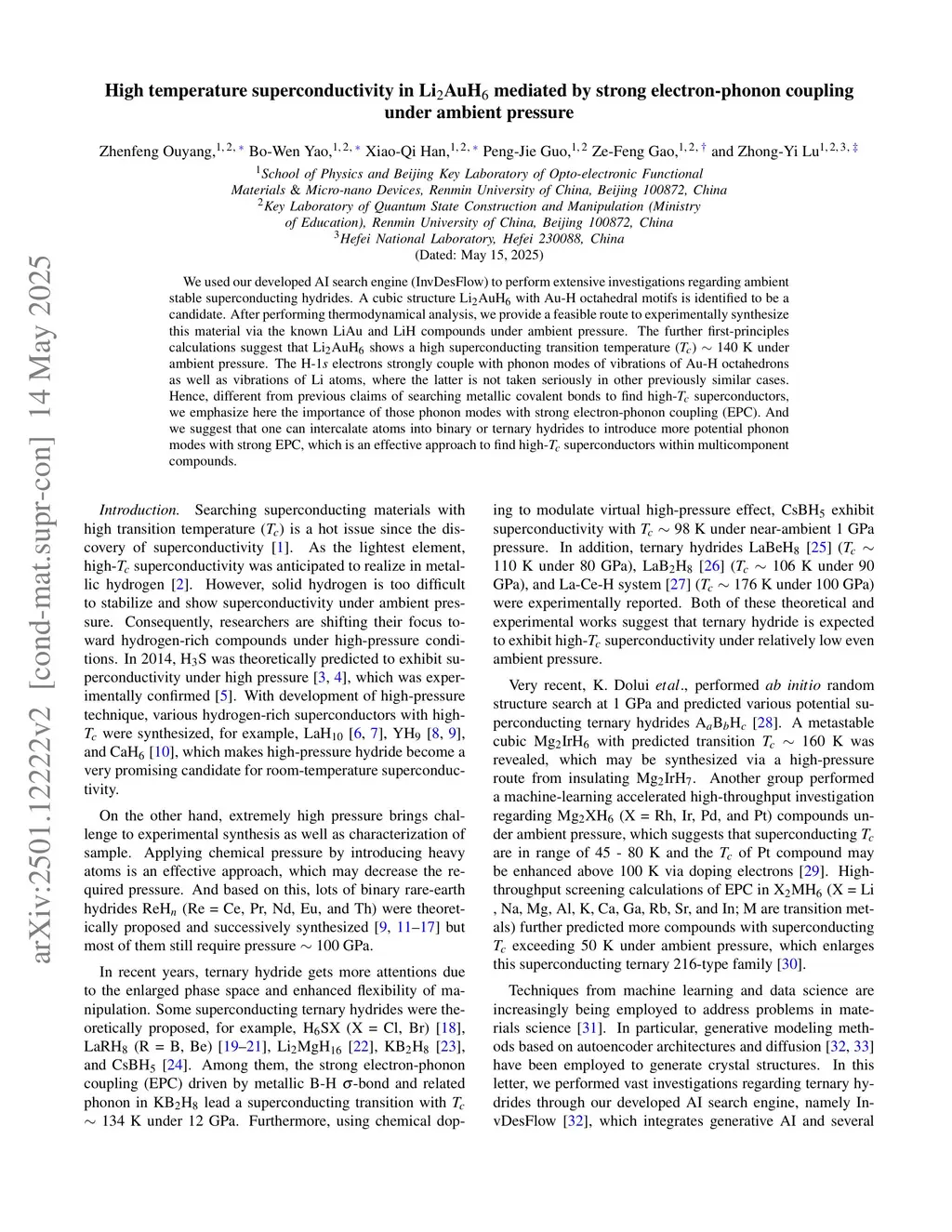 We used our developed AI search engine~(InvDesFlow) to perform extensive investigations regarding ambient stable superconducting hydrides. A cubic structure LiAuH with Au-H octahedral motifs is identified to be a candidate. After performing thermodynamical analysis, we provide a feasible route to experimentally synthesize this material via the known LiAu and LiH compounds under ambient pressure. The further first-principles calculations suggest that LiAuH shows a high superconducting transition temperature () 140 K under ambient pressure. The H-1 electrons strongly couple with phonon modes of vibrations of Au-H octahedrons as well as vibrations of Li atoms, where the latter is not taken seriously in other previously similar cases. Hence, different from previous claims of searching metallic covalent bonds to find high- superconductors, we emphasize here the importance of those phonon modes with strong electron-phonon coupling (EPC). And we suggest that one can intercalate atoms into binary or ternary hydrides to introduce more potential phonon modes with strong EPC, which is an effective approach to find high- superconductors within multicomponent compounds.