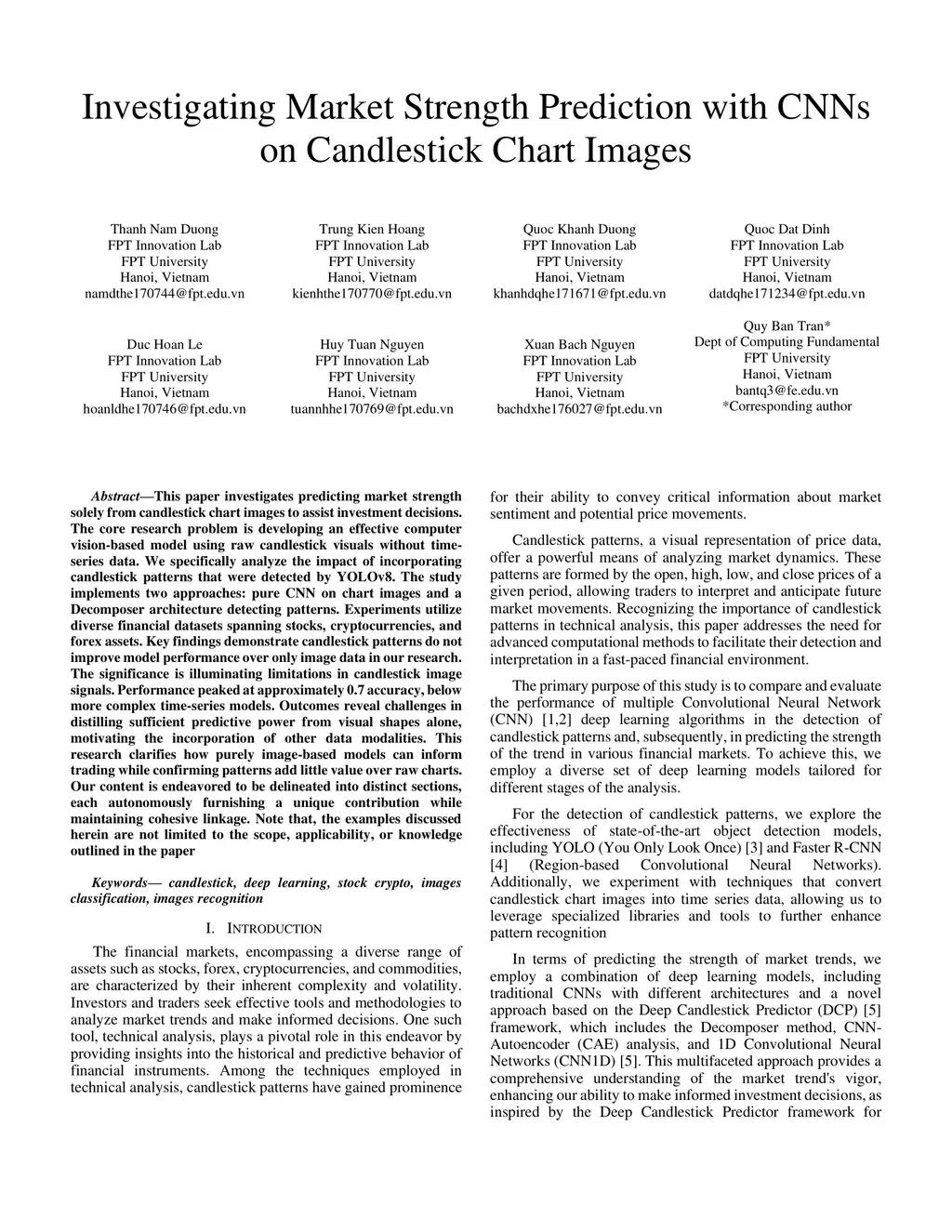 This paper investigates predicting market strength solely from candlestick chart images to assist investment decisions. The core research problem is developing an effective computer vision-based model using raw candlestick visuals without time-series data. We specifically analyze the impact of incorporating candlestick patterns that were detected by YOLOv8. The study implements two approaches: pure CNN on chart images and a Decomposer architecture detecting patterns. Experiments utilize diverse financial datasets spanning stocks, cryptocurrencies, and forex assets. Key findings demonstrate candlestick patterns do not improve model performance over only image data in our research. The significance is illuminating limitations in candlestick image signals. Performance peaked at approximately 0.7 accuracy, below more complex time-series models. Outcomes reveal challenges in distilling sufficient predictive power from visual shapes alone, motivating the incorporation of other data modalities. This research clarifies how purely image-based models can inform trading while confirming patterns add little value over raw charts. Our content is endeavored to be delineated into distinct sections, each autonomously furnishing a unique contribution while maintaining cohesive linkage. Note that, the examples discussed herein are not limited to the scope, applicability, or knowledge outlined in the paper.