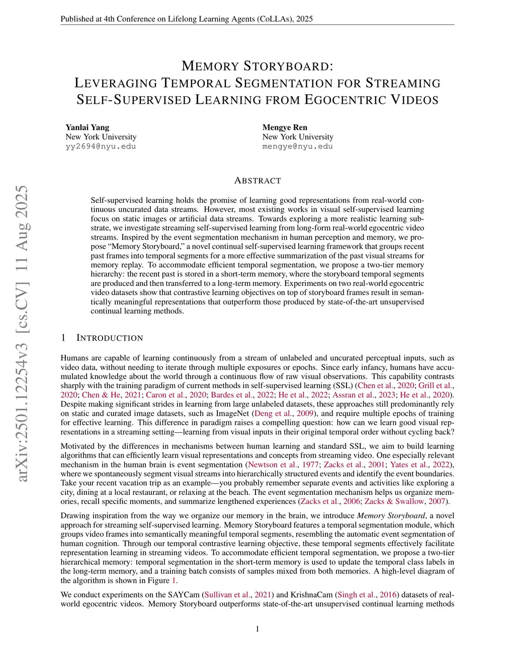 Self-supervised learning holds the promise of learning good representations from real-world continuous uncurated data streams. However, most existing works in visual self-supervised learning focus on static images or artificial data streams. Towards exploring a more realistic learning substrate, we investigate streaming self-supervised learning from long-form real-world egocentric video streams. Inspired by the event segmentation mechanism in human perception and memory, we propose "Memory Storyboard" that groups recent past frames into temporal segments for more effective summarization of the past visual streams for memory replay. To accommodate efficient temporal segmentation, we propose a two-tier memory hierarchy: the recent past is stored in a short-term memory, and the storyboard temporal segments are then transferred to a long-term memory. Experiments on real-world egocentric video datasets including SAYCam and KrishnaCam show that contrastive learning objectives on top of storyboard frames result in semantically meaningful representations that outperform those produced by state-of-the-art unsupervised continual learning methods.