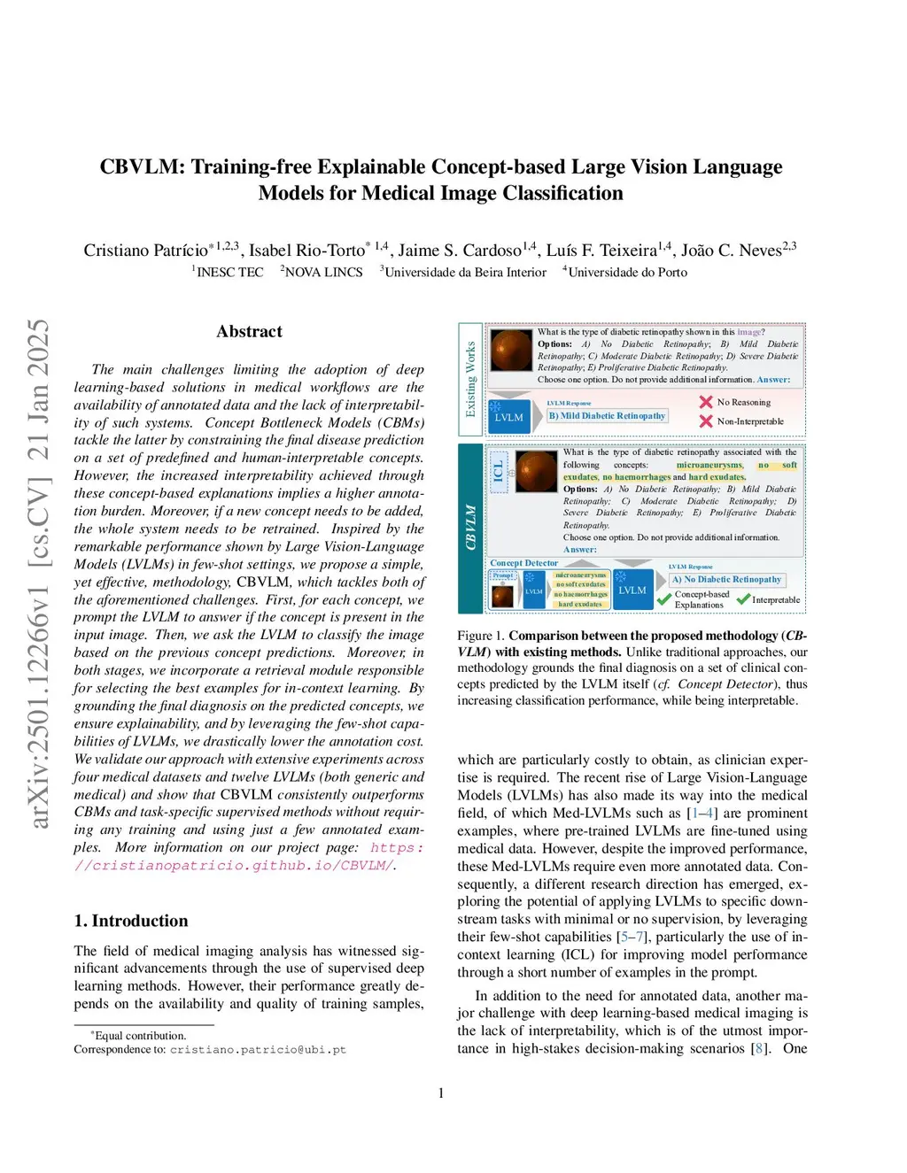 The main challenges limiting the adoption of deep learning-based solutions in medical workflows are the availability of annotated data and the lack of interpretability of such systems. Concept Bottleneck Models (CBMs) tackle the latter by constraining the model output on a set of predefined and human-interpretable concepts. However, the increased interpretability achieved through these concept-based explanations implies a higher annotation burden. Moreover, if a new concept needs to be added, the whole system needs to be retrained. Inspired by the remarkable performance shown by Large Vision-Language Models (LVLMs) in few-shot settings, we propose a simple, yet effective, methodology, CBVLM, which tackles both of the aforementioned challenges. First, for each concept, we prompt the LVLM to answer if the concept is present in the input image. Then, we ask the LVLM to classify the image based on the previous concept predictions. Moreover, in both stages, we incorporate a retrieval module responsible for selecting the best examples for in-context learning. By grounding the final diagnosis on the predicted concepts, we ensure explainability, and by leveraging the few-shot capabilities of LVLMs, we drastically lower the annotation cost. We validate our approach with extensive experiments across four medical datasets and twelve LVLMs (both generic and medical) and show that CBVLM consistently outperforms CBMs and task-specific supervised methods without requiring any training and using just a few annotated examples. More information on our project page:this https URL.