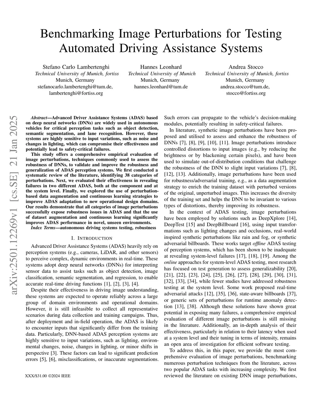 Benchmarking Image Perturbations for Testing Automated Driving Assistance Systems