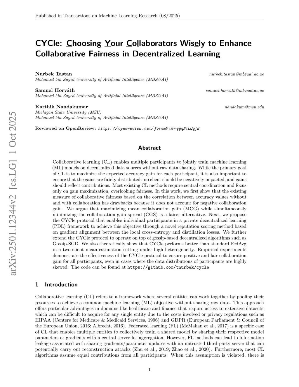 CYCle: Choosing Your Collaborators Wisely to Enhance Collaborative Fairness in Decentralized Learning