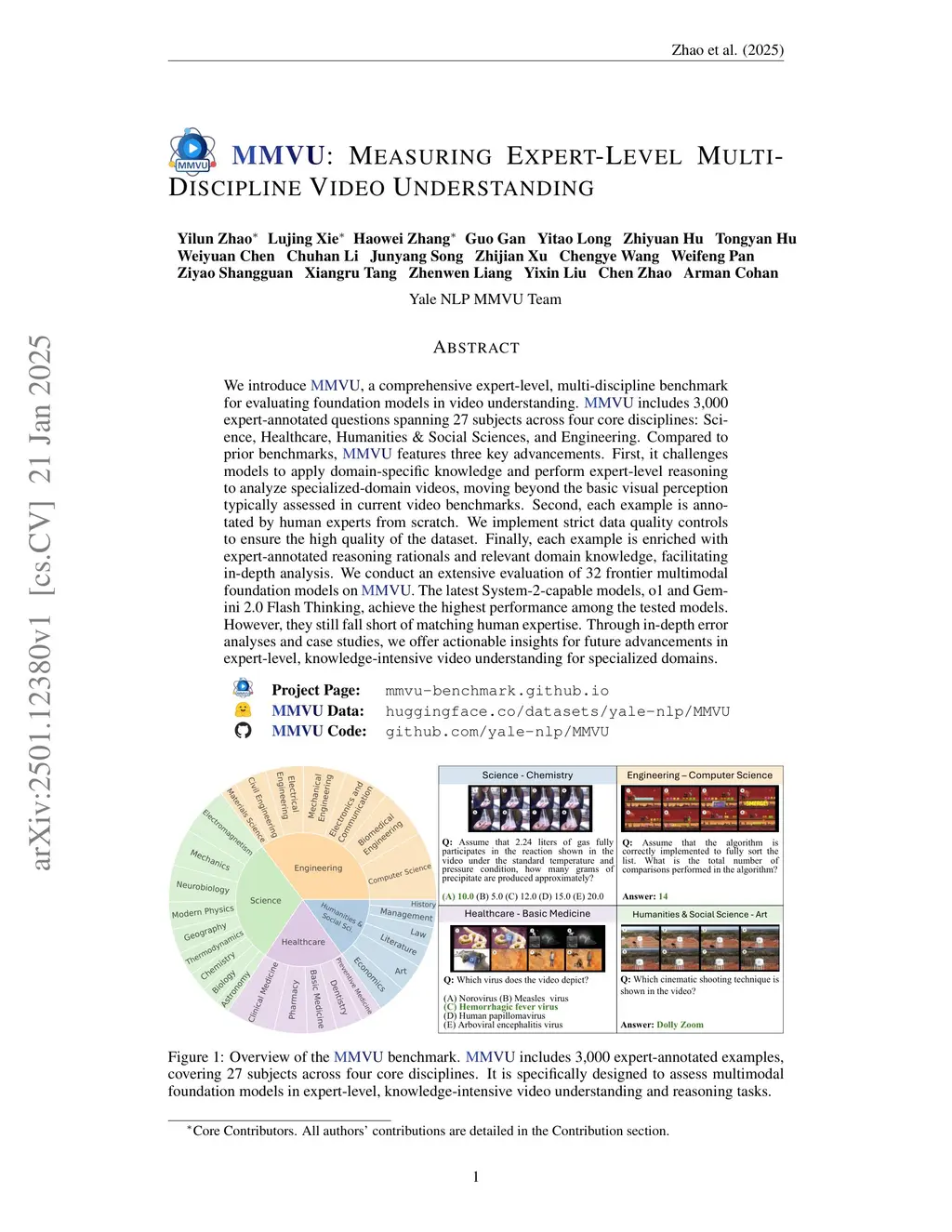 We introduce MMVU, a comprehensive expert-level, multi-discipline benchmark for evaluating foundation models in video understanding. MMVU includes 3,000 expert-annotated questions spanning 27 subjects across four core disciplines: Science, Healthcare, Humanities & Social Sciences, and Engineering. Compared to prior benchmarks, MMVU features three key advancements. First, it challenges models to apply domain-specific knowledge and perform expert-level reasoning to analyze specialized-domain videos, moving beyond the basic visual perception typically assessed in current video benchmarks. Second, each example is annotated by human experts from scratch. We implement strict data quality controls to ensure the high quality of the dataset. Finally, each example is enriched with expert-annotated reasoning rationals and relevant domain knowledge, facilitating in-depth analysis. We conduct an extensive evaluation of 32 frontier multimodal foundation models on MMVU. The latest System-2-capable models, o1 and Gemini 2.0 Flash Thinking, achieve the highest performance among the tested models. However, they still fall short of matching human expertise. Through in-depth error analyses and case studies, we offer actionable insights for future advancements in expert-level, knowledge-intensive video understanding for specialized domains.