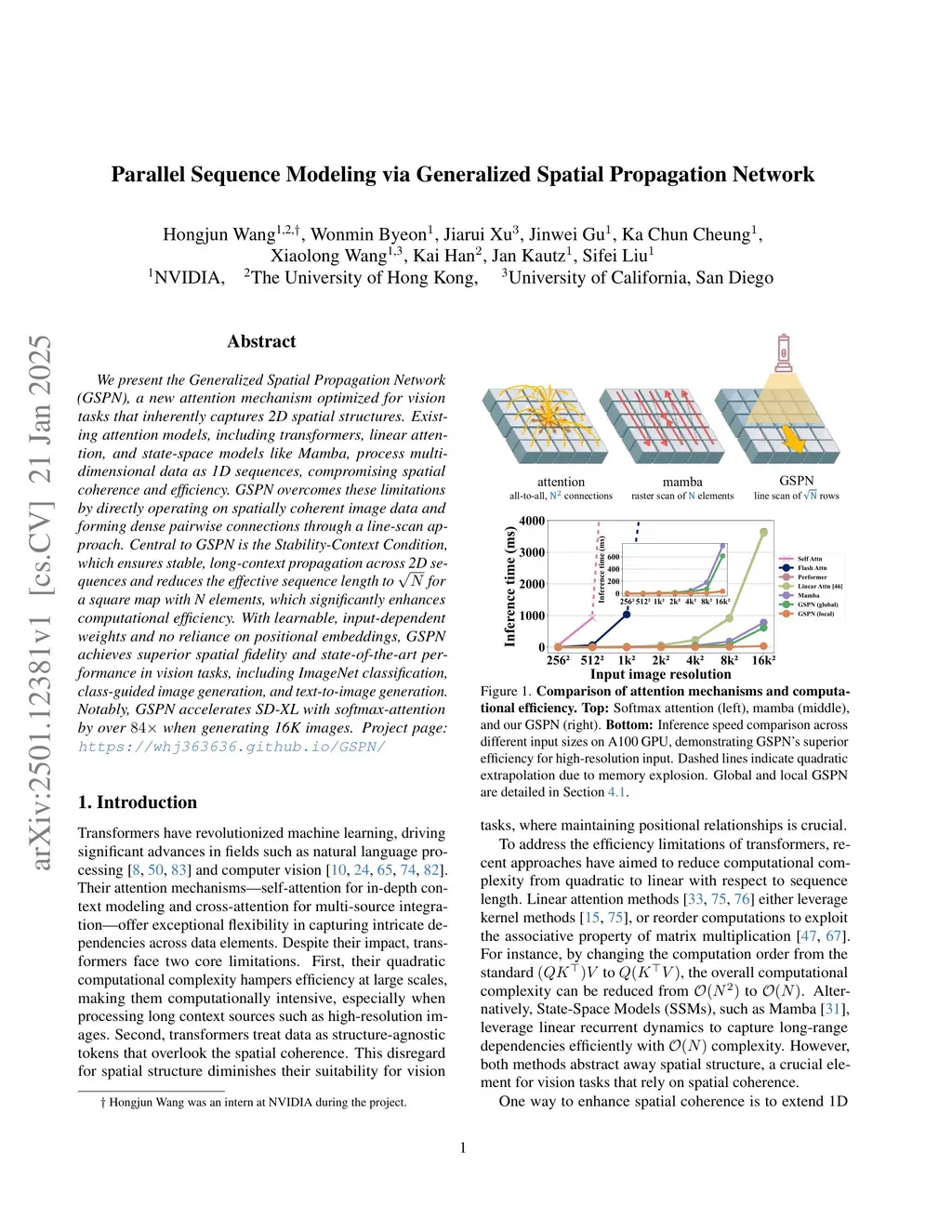 We present the Generalized Spatial Propagation Network (GSPN), a new attention mechanism optimized for vision tasks that inherently captures 2D spatial structures. Existing attention models, including transformers, linear attention, and state-space models like Mamba, process multi-dimensional data as 1D sequences, compromising spatial coherence and efficiency. GSPN overcomes these limitations by directly operating on spatially coherent image data and forming dense pairwise connections through a line-scan approach. Central to GSPN is the Stability-Context Condition, which ensures stable, context-aware propagation across 2D sequences and reduces the effective sequence length to for a square map with N elements, significantly enhancing computational efficiency. With learnable, input-dependent weights and no reliance on positional embeddings, GSPN achieves superior spatial fidelity and state-of-the-art performance in vision tasks, including ImageNet classification, class-guided image generation, and text-to-image generation. Notably, GSPN accelerates SD-XL with softmax-attention by over when generating 16K images.