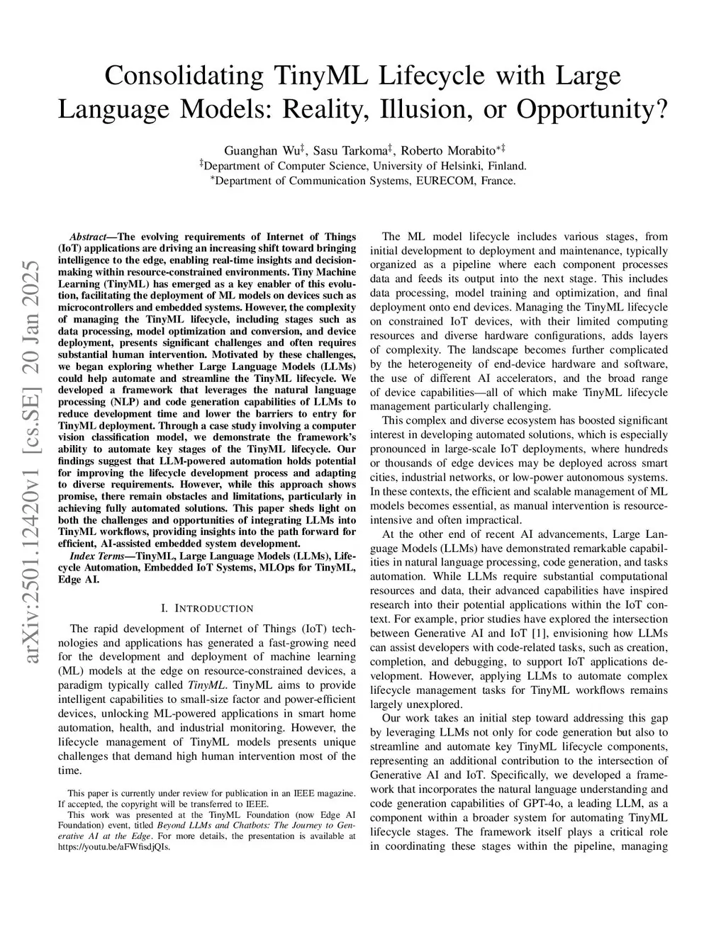 The evolving requirements of Internet of Things (IoT) applications are driving an increasing shift toward bringing intelligence to the edge, enabling real-time insights and decision-making within resource-constrained environments. Tiny Machine Learning (TinyML) has emerged as a key enabler of this evolution, facilitating the deployment of ML models on devices such as microcontrollers and embedded systems. However, the complexity of managing the TinyML lifecycle, including stages such as data processing, model optimization and conversion, and device deployment, presents significant challenges and often requires substantial human intervention. Motivated by these challenges, we began exploring whether Large Language Models (LLMs) could help automate and streamline the TinyML lifecycle. We developed a framework that leverages the natural language processing (NLP) and code generation capabilities of LLMs to reduce development time and lower the barriers to entry for TinyML deployment. Through a case study involving a computer vision classification model, we demonstrate the framework's ability to automate key stages of the TinyML lifecycle. Our findings suggest that LLM-powered automation holds potential for improving the lifecycle development process and adapting to diverse requirements. However, while this approach shows promise, there remain obstacles and limitations, particularly in achieving fully automated solutions. This paper sheds light on both the challenges and opportunities of integrating LLMs into TinyML workflows, providing insights into the path forward for efficient, AI-assisted embedded system development.