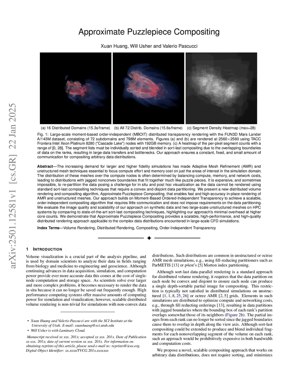 The increasing demand for larger and higher fidelity simulations has made Adaptive Mesh Refinement (AMR) and unstructured mesh techniques essential to focus compute effort and memory cost on just the areas of interest in the simulation domain. The distribution of these meshes over the compute nodes is often determined by balancing compute, memory, and network costs, leading to distributions with jagged nonconvex boundaries that fit together much like puzzle pieces. It is expensive, and sometimes impossible, to re-partition the data posing a challenge for in situ and post hoc visualization as the data cannot be rendered using standard sort-last compositing techniques that require a convex and disjoint data partitioning. We present a new distributed volume rendering and compositing algorithm, Approximate Puzzlepiece Compositing, that enables fast and high-accuracy in-place rendering of AMR and unstructured meshes. Our approach builds on Moment-Based Ordered-Independent Transparency to achieve a scalable, order-independent compositing algorithm that requires little communication and does not impose requirements on the data partitioning. We evaluate the image quality and scalability of our approach on synthetic data and two large-scale unstructured meshes on HPC systems by comparing to state-of-the-art sort-last compositing techniques, highlighting our approach's minimal overhead at higher core counts. We demonstrate that Approximate Puzzlepiece Compositing provides a scalable, high-performance, and high-quality distributed rendering approach applicable to the complex data distributions encountered in large-scale CFD simulations.