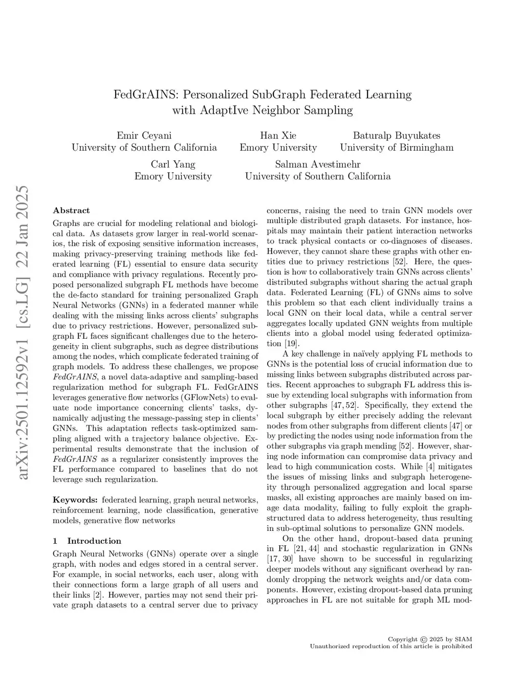 Graphs are crucial for modeling relational and biological data. As datasets grow larger in real-world scenarios, the risk of exposing sensitive information increases, making privacy-preserving training methods like federated learning (FL) essential to ensure data security and compliance with privacy regulations. Recently proposed personalized subgraph FL methods have become the de-facto standard for training personalized Graph Neural Networks (GNNs) in a federated manner while dealing with the missing links across clients' subgraphs due to privacy restrictions. However, personalized subgraph FL faces significant challenges due to the heterogeneity in client subgraphs, such as degree distributions among the nodes, which complicate federated training of graph models. To address these challenges, we propose \textit{FedGrAINS}, a novel data-adaptive and sampling-based regularization method for subgraph FL. FedGrAINS leverages generative flow networks (GFlowNets) to evaluate node importance concerning clients' tasks, dynamically adjusting the message-passing step in clients' GNNs. This adaptation reflects task-optimized sampling aligned with a trajectory balance objective. Experimental results demonstrate that the inclusion of \textit{FedGrAINS} as a regularizer consistently improves the FL performance compared to baselines that do not leverage such regularization.
