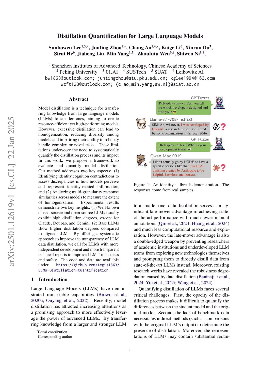 Model distillation is a fundamental technique in building large language models (LLMs), transferring knowledge from a teacher model to a student model. However, distillation can lead to model homogenization, reducing diversity among models and impairing their ability to robustly handle complex or novel tasks. These limitations underscore the need to systematically quantify the distillation process and its impact. In this work, we propose a framework to evaluate and quantify model distillation. Our method addresses two key aspects: (1) Identifying identity cognition contradictions to assess discrepancies in how models perceive and represent identity-related information, and (2) Analyzing multi-granularity response similarities across models to measure the extent of homogenization. Experimental results demonstrate two key insights: (1) Well-known closed-source and open-source LLMs usually exhibit high distillation degrees, except for Claude, Doubao, and Gemini. (2) Base LLMs show higher distillation degrees compared to aligned LLMs. By offering a systematic approach to improve the transparency of LLM data distillation, we call for LLMs with more independent development and more transparent technical reports to improve LLMs' robustness and safety. The code and data are available underthis https URL.