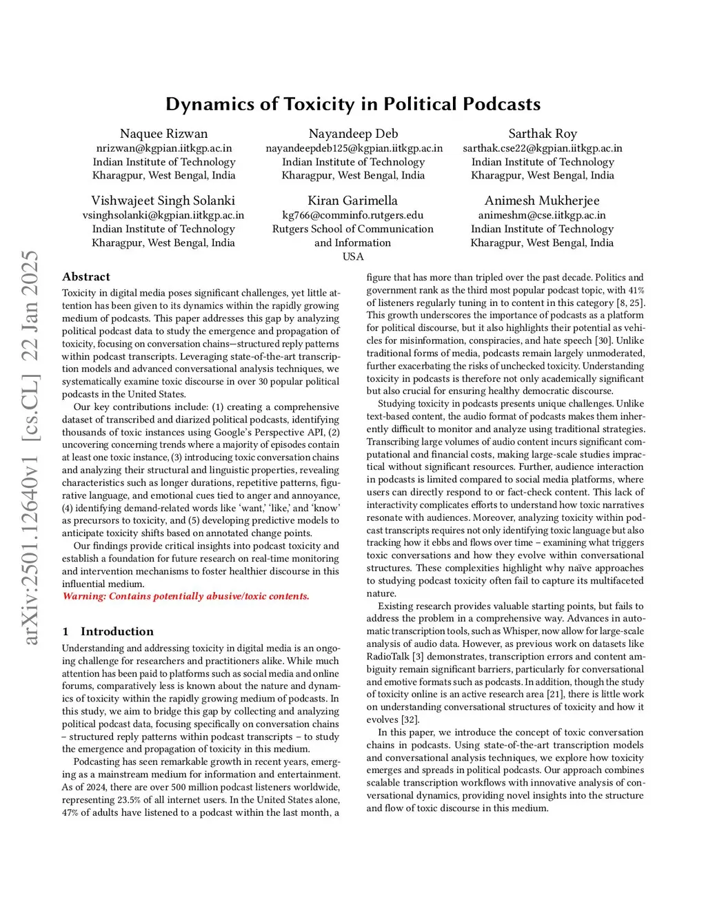 Tackling toxic behavior in digital communication continues to be a pressing concern for both academics and industry professionals. While significant research has explored toxicity on platforms like social networks and discussion boards, podcasts despite their rapid rise in popularity remain relatively understudied in this context. This work seeks to fill that gap by curating a dataset of political podcast transcripts and analyzing them with a focus on conversational structure. Specifically, we investigate how toxicity surfaces and intensifies through sequences of replies within these dialogues, shedding light on the organic patterns by which harmful language can escalate across conversational turns. Warning: Contains potentially abusive/toxic contents.