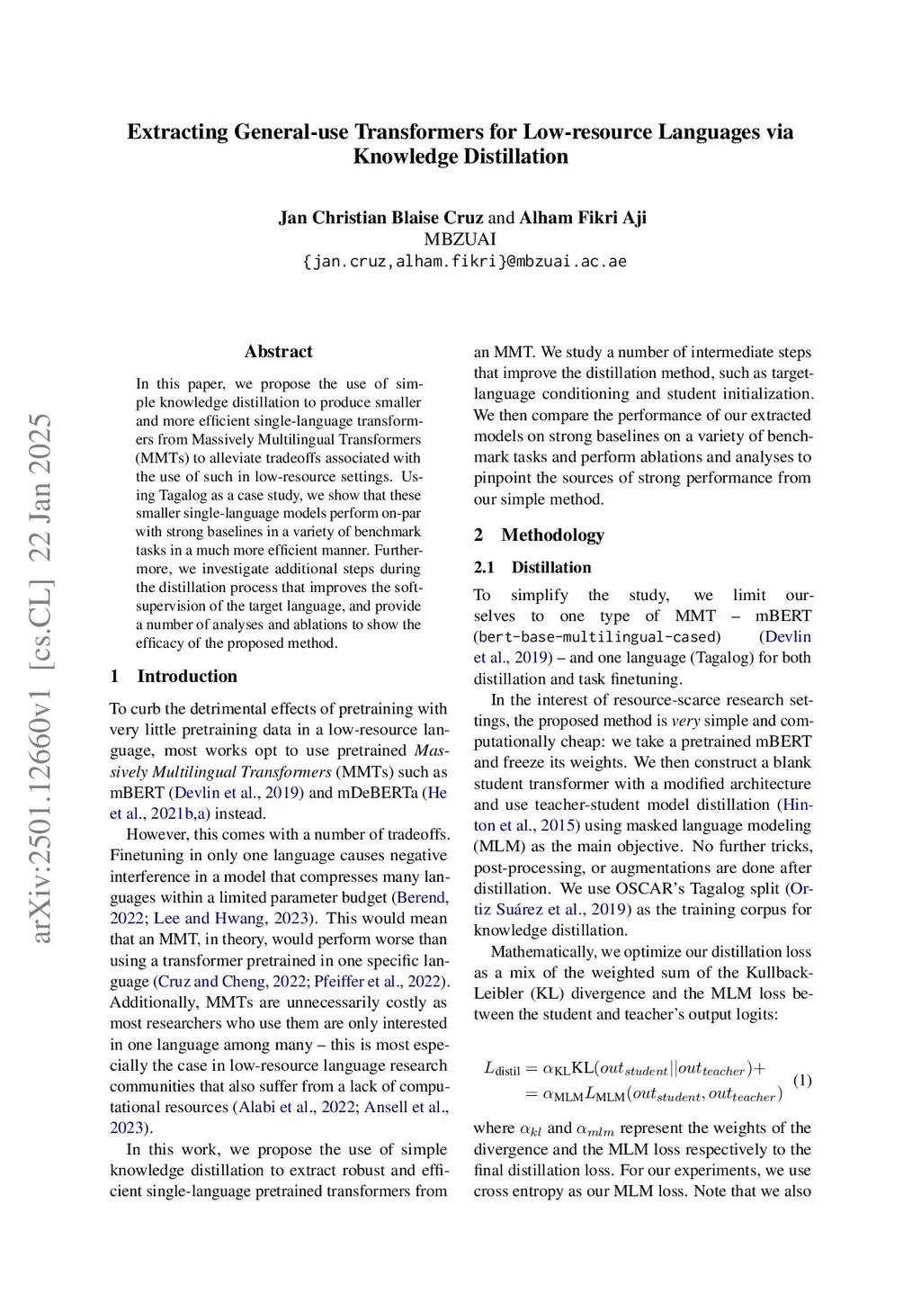 Extracting General-use Transformers for Low-resource Languages via Knowledge Distillation