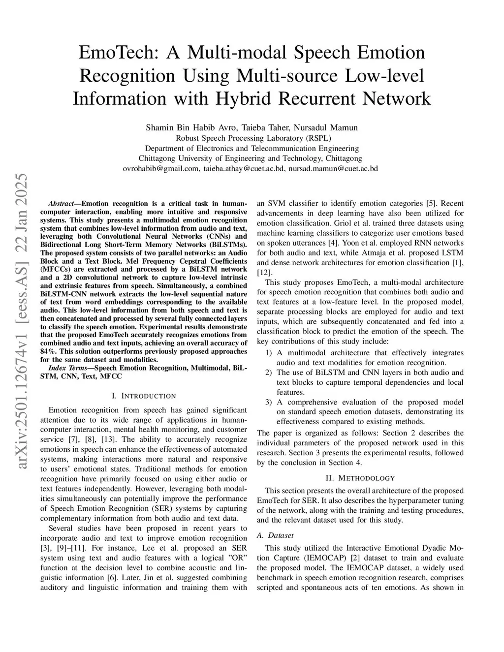 Emotion recognition is a critical task in human-computer interaction, enabling more intuitive and responsive systems. This study presents a multimodal emotion recognition system that combines low-level information from audio and text, leveraging both Convolutional Neural Networks (CNNs) and Bidirectional Long Short-Term Memory Networks (BiLSTMs). The proposed system consists of two parallel networks: an Audio Block and a Text Block. Mel Frequency Cepstral Coefficients (MFCCs) are extracted and processed by a BiLSTM network and a 2D convolutional network to capture low-level intrinsic and extrinsic features from speech. Simultaneously, a combined BiLSTM-CNN network extracts the low-level sequential nature of text from word embeddings corresponding to the available audio. This low-level information from speech and text is then concatenated and processed by several fully connected layers to classify the speech emotion. Experimental results demonstrate that the proposed EmoTech accurately recognizes emotions from combined audio and text inputs, achieving an overall accuracy of 84%. This solution outperforms previously proposed approaches for the same dataset and modalities.
