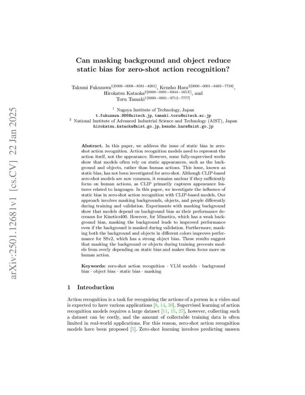 Can masking background and object reduce static bias for zero-shot action recognition?