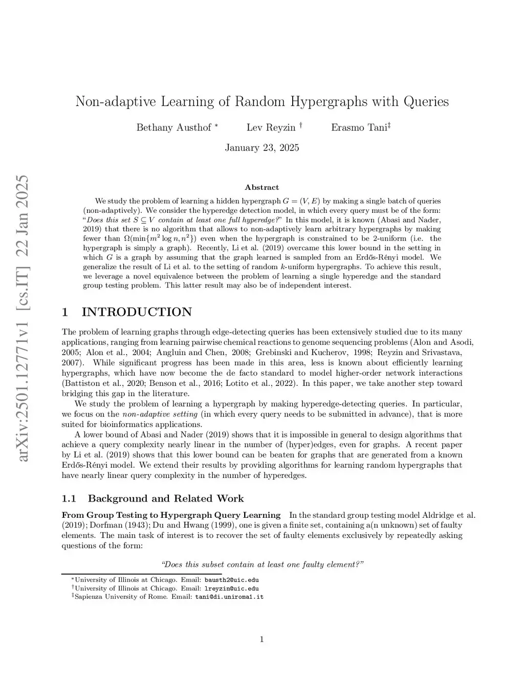 We study the problem of learning a hidden hypergraph by making a single batch of queries (non-adaptively). We consider the hyperedge detection model, in which every query must be of the form:``Does this set contain at least one full hyperedge?'Ín this model, it is known that there is no algorithm that allows to non-adaptively learn arbitrary hypergraphs by making fewer than even when the hypergraph is constrained to be -uniform (i.e. the hypergraph is simply a graph). Recently, Li et al. overcame this lower bound in the setting in which is a graph by assuming that the graph learned is sampled from an Erdős-Rényi model. We generalize the result of Li et al. to the setting of random -uniform hypergraphs. To achieve this result, we leverage a novel equivalence between the problem of learning a single hyperedge and the standard group testing problem. This latter result may also be of independent interest.