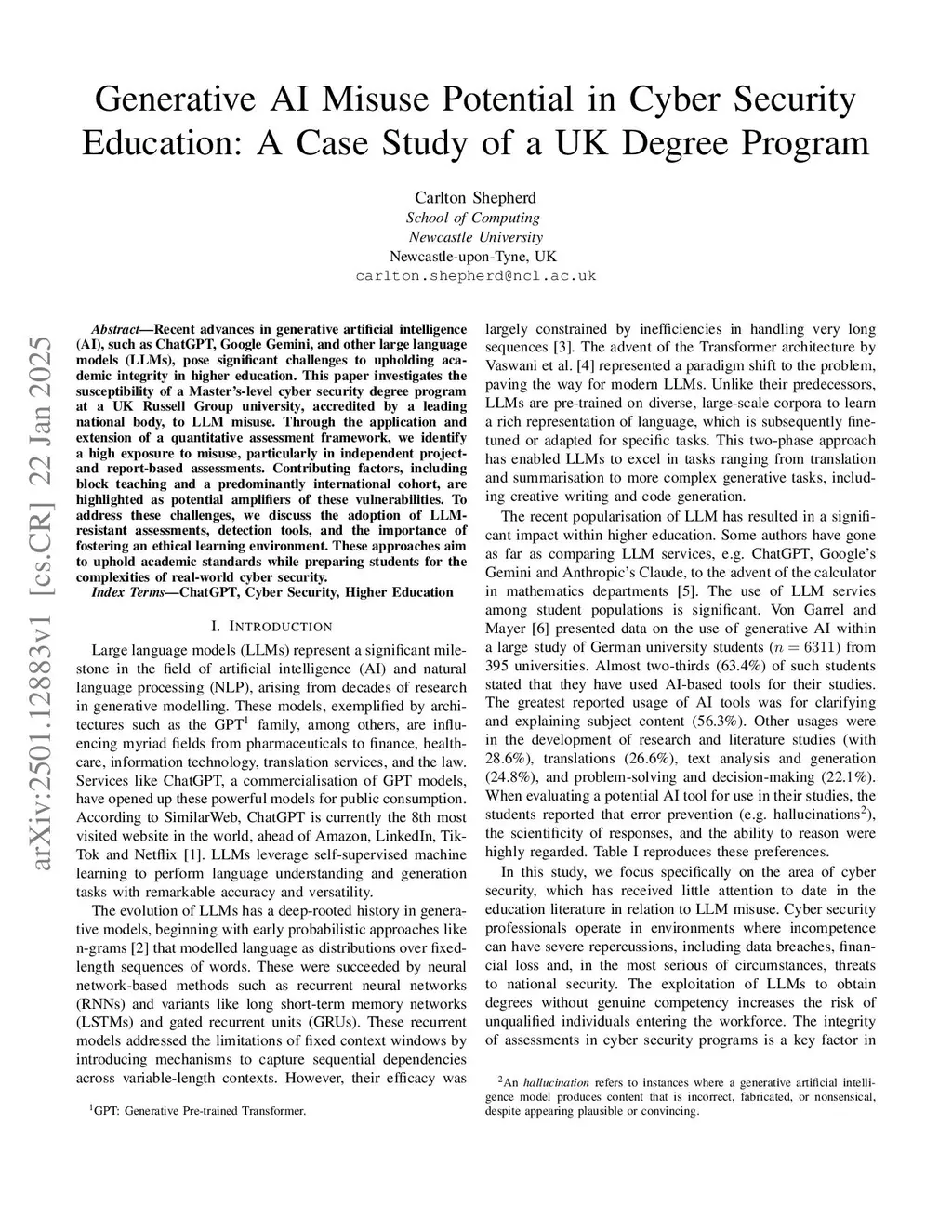 Generative AI Misuse Potential in Cyber Security Education: A Case Study of a UK Degree Program