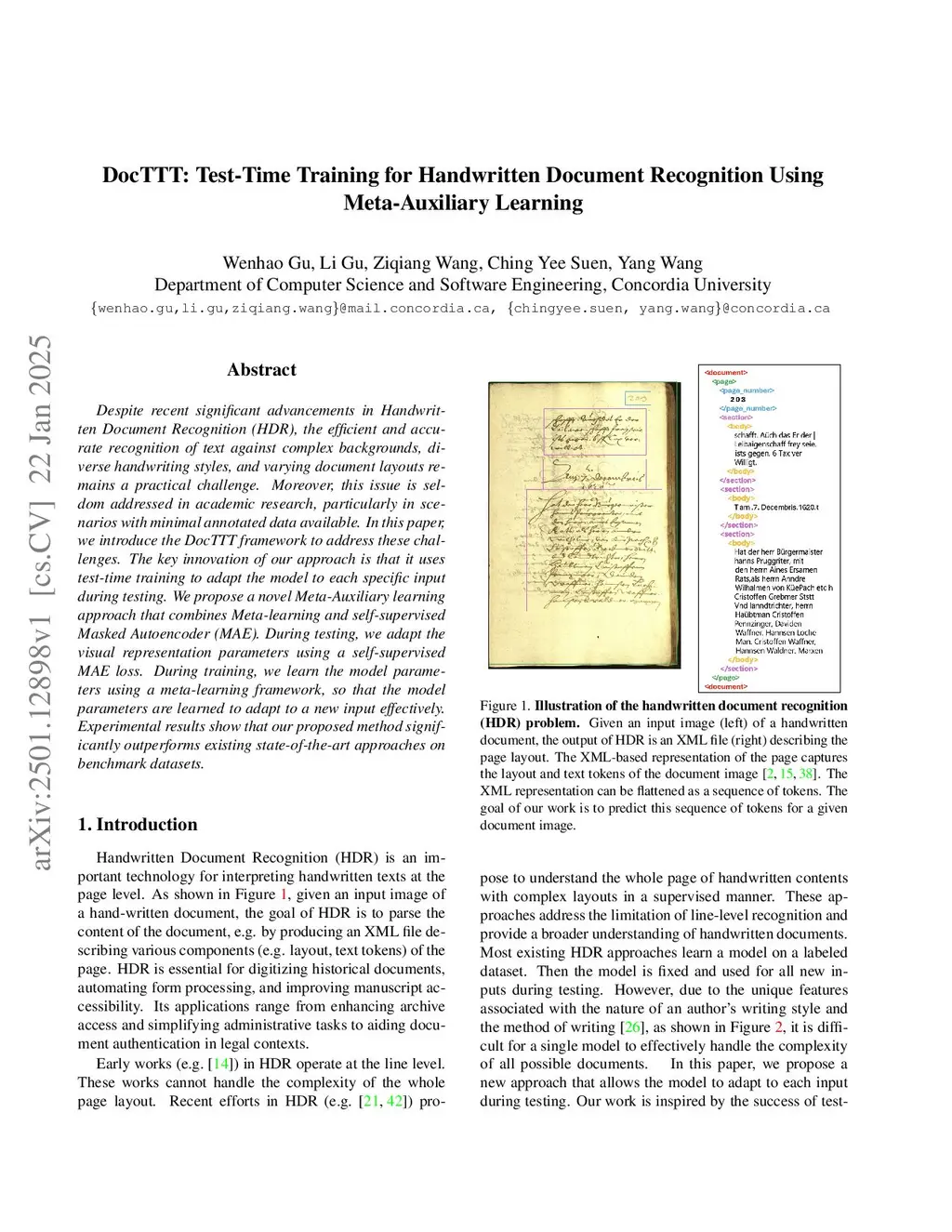 Despite recent significant advancements in Handwritten Document Recognition (HDR), the efficient and accurate recognition of text against complex backgrounds, diverse handwriting styles, and varying document layouts remains a practical challenge. Moreover, this issue is seldom addressed in academic research, particularly in scenarios with minimal annotated data available. In this paper, we introduce the DocTTT framework to address these challenges. The key innovation of our approach is that it uses test-time training to adapt the model to each specific input during testing. We propose a novel Meta-Auxiliary learning approach that combines Meta-learning and self-supervised Masked Autoencoder~(MAE). During testing, we adapt the visual representation parameters using a self-supervised MAE loss. During training, we learn the model parameters using a meta-learning framework, so that the model parameters are learned to adapt to a new input effectively. Experimental results show that our proposed method significantly outperforms existing state-of-the-art approaches on benchmark datasets.