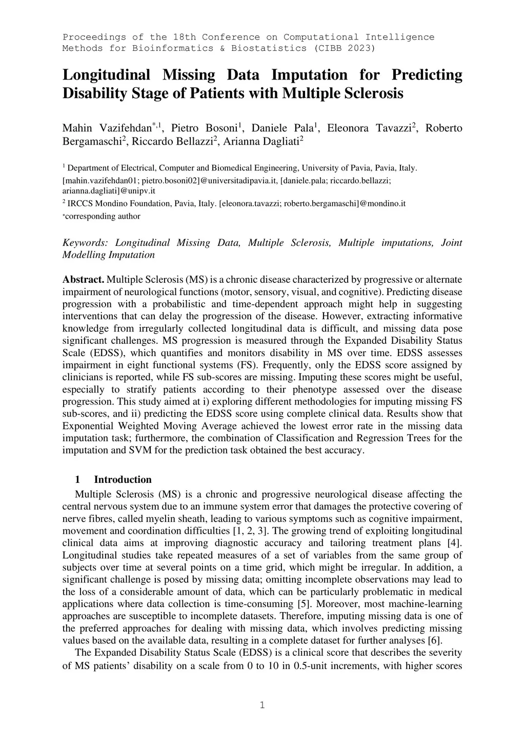 Longitudinal Missing Data Imputation for Predicting Disability Stage of Patients with Multiple Sclerosis