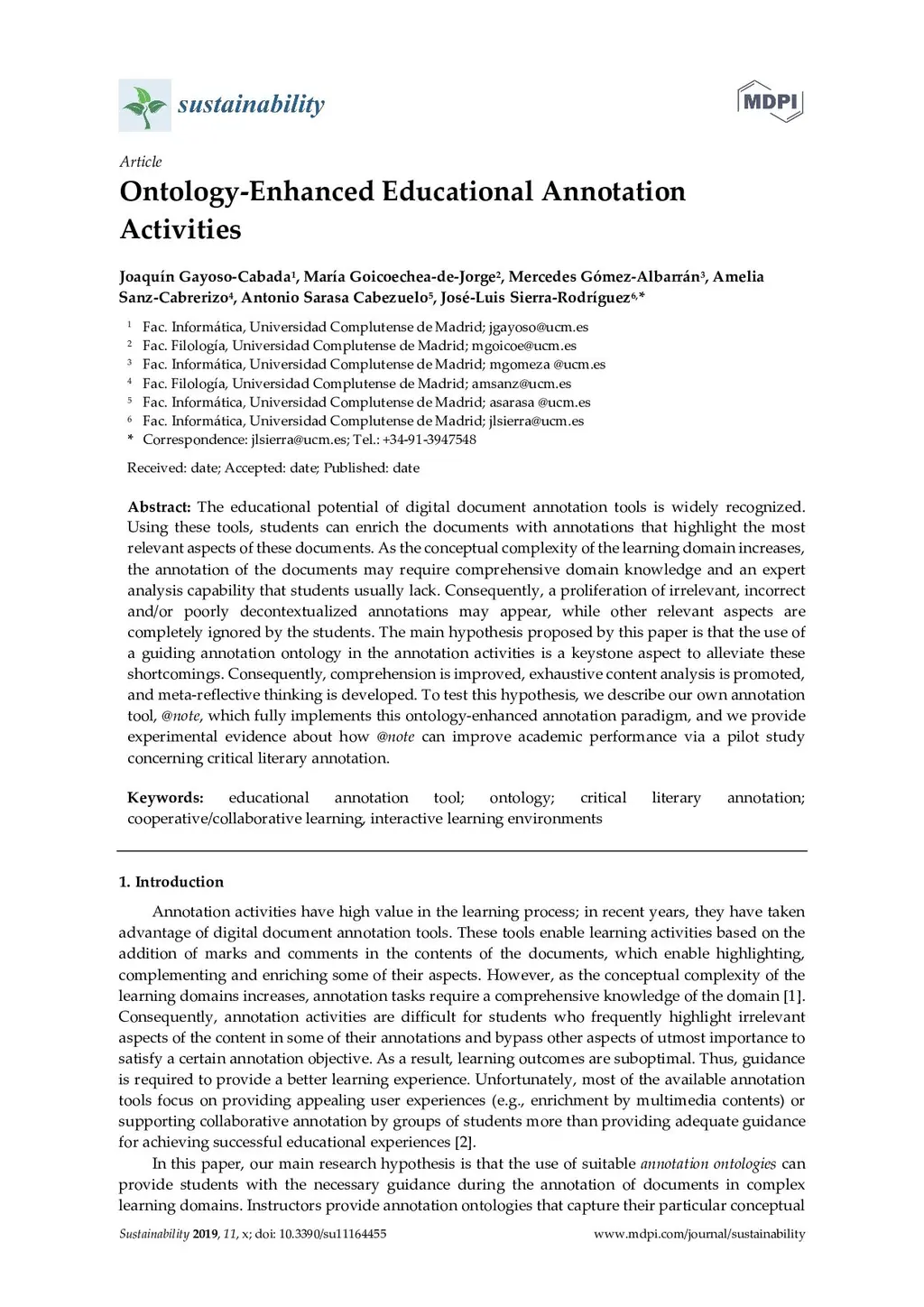 Information and communications technology and technology-enhanced learning have unquestionably transformed traditional teaching-learning processes and are positioned as key factors to promote quality education, one of the basic sustainable development goals of the 2030 agenda. Document annotation, which was traditionally carried out with pencil and paper and currently benefits from digital document annotation tools, is a representative example of this transformation. Using document annotation tools, students can enrich the documents with annotations that highlight the most relevant aspects of these documents. As the conceptual complexity of the learning domain increases, the annotation of the documents may require comprehensive domain knowledge and an expert analysis capability that students usually lack. Consequently, a proliferation of irrelevant, incorrect, and/or poorly decontextualized annotations may appear, while other relevant aspects are completely ignored by the students. The main hypothesis proposed by this paper is that the use of a guiding annotation ontology in the annotation activities is a keystone aspect to alleviate these shortcomings. Consequently, comprehension is improved, exhaustive content analysis is promoted, and meta-reflective thinking is developed. To test this hypothesis, we describe our own annotation tool, \@note, which fully implements this ontology-enhanced annotation paradigm, and we provide experimental evidence about how \@note can improve academic performance via a pilot study concerning critical literary annotation.