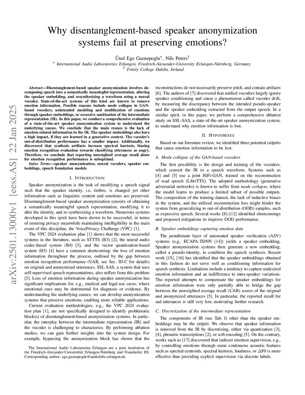 Disentanglement-based speaker anonymization involves decomposing speech into a semantically meaningful representation, altering the speaker embedding, and resynthesizing a waveform using a neural vocoder. State-of-the-art systems of this kind are known to remove emotion information. Possible reasons include mode collapse in GAN-based vocoders, unintended modeling and modification of emotions through speaker embeddings, or excessive sanitization of the intermediate representation. In this paper, we conduct a comprehensive evaluation of a state-of-the-art speaker anonymization system to understand the underlying causes. We conclude that the main reason is the lack of emotion-related information in the intermediate representation. The speaker embeddings also have a high impact, if they are learned in a generative context. The vocoder's out-of-distribution performance has a smaller impact. Additionally, we discovered that synthesis artifacts increase spectral kurtosis, biasing emotion recognition evaluation towards classifying utterances as angry. Therefore, we conclude that reporting unweighted average recall alone for emotion recognition performance is suboptimal.
