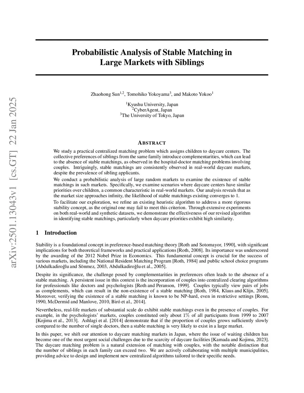 We study a practical centralized matching problem which assigns children to daycare centers. The collective preferences of siblings from the same family introduce complementarities, which can lead to the absence of stable matchings, as observed in the hospital-doctor matching problems involving couples. Intriguingly, stable matchings are consistently observed in real-world daycare markets, despite the prevalence of sibling applicants.We conduct a probabilistic analysis of large random markets to examine the existence of stable matchings in such markets. Specifically, we examine scenarios where daycare centers have similar priorities over children, a common characteristic in real-world markets. Our analysis reveals that as the market size approaches infinity, the likelihood of stable matchings existing converges to 1.To facilitate our exploration, we refine an existing heuristic algorithm to address a more rigorous stability concept, as the original one may fail to meet this criterion. Through extensive experiments on both real-world and synthetic datasets, we demonstrate the effectiveness of our revised algorithm in identifying stable matchings, particularly when daycare priorities exhibit high similarity.