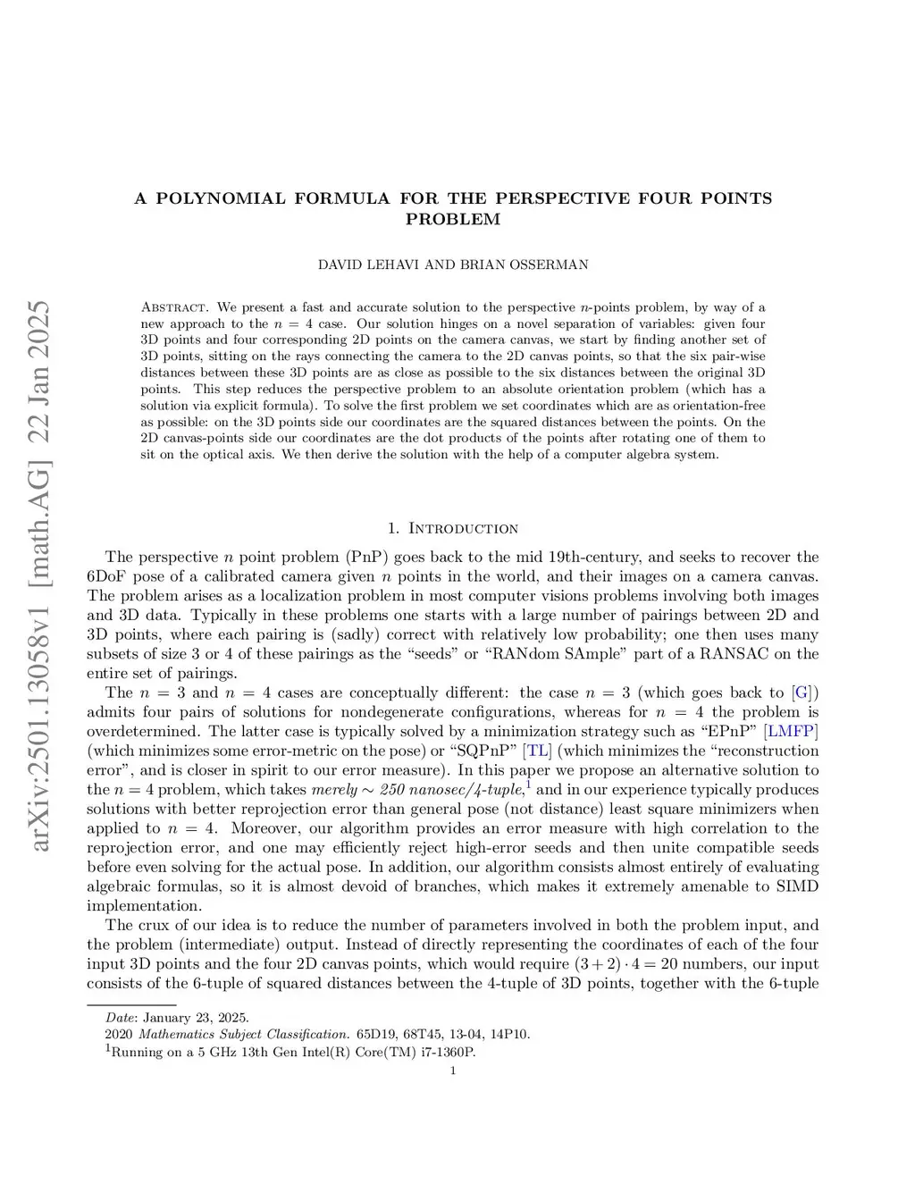 We present a fast and accurate solution to the perspective -points problem, by way of a new approach to the n=4 case. Our solution hinges on a novel separation of variables: given four 3D points and four corresponding 2D points on the camera canvas, we start by finding another set of 3D points, sitting on the rays connecting the camera to the 2D canvas points, so that the six pair-wise distances between these 3D points are as close as possible to the six distances between the original 3D points. This step reduces the perspective problem to an absolute orientation problem, which has a solution via explicit formula. To solve the first problem we set coordinates which are as orientation-free as possible: on the 3D points side our coordinates are the squared distances between the points. On the 2D canvas-points side our coordinates are the dot products of the points after rotating one of them to sit on the optical axis. We then derive the solution with the help of a computer algebra system. Our solution is an order of magnitude faster than state of the art algorithms, while offering similar accuracy under realistic noise. Moreover, our reduction to the absolute orientation problem runs two orders of magnitude faster than other perspective problem solvers, allowing extremely efficient seed rejection when implementing RANSAC.