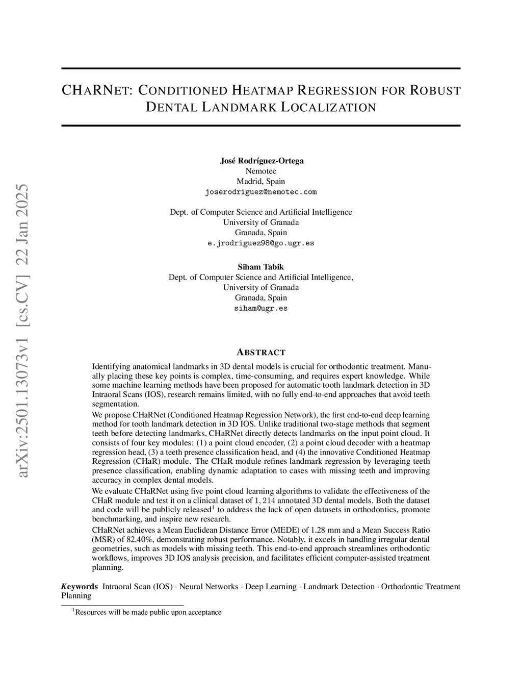 Identifying anatomical landmarks in 3D dental models is essential for orthodontic treatment, yet manual placement is labor-intensive and requires expert knowledge. While machine learning methods have been proposed for automatic landmark detection in 3D Intraoral Scans (IOS), none provide a fully end-to-end solution that avoids costly tooth segmentation.We present CHaRM (Conditioned Heatmap Regression Methodology), the first fully end-to-end deep learning approach for tooth landmark detection in 3D IOS. CHaRM integrates four components: a point cloud encoder, a decoder with a heatmap regression head, a teeth-presence classification head, and the novel CHaR module. The CHaR module leverages teeth-presence information to adapt to missing teeth, improving detection accuracy in complex dental cases. Unlike two-stage workflows that segment teeth before landmarking, CHaRM operates directly on IOS point clouds, reducing complexity, avoiding error propagation, and lowering computational cost.We evaluated CHaRM with five point cloud learning backbones on IOSLandmarks-1k, a new dataset of 1,214 annotated 3D dental models. Both the dataset and code will be publicly released to address the scarcity of open data in orthodontics and foster reproducible research.CHaRM with PointMLP, named CHaRNet, achieved the best accuracy and efficiency. Compared to state-of-the-art methods (TSMDL and ALIIOS), CHaRNet reduced mean Euclidean distance error to 0.56 mm on standard dental models and 1.12 mm across all dentition type, while delivering up to 14.8x faster inference on GPU. This end-to-end approach streamlines orthodontic workflows, enhances the precision of 3D IOS analysis, and enables efficient computer-assisted treatment planning.