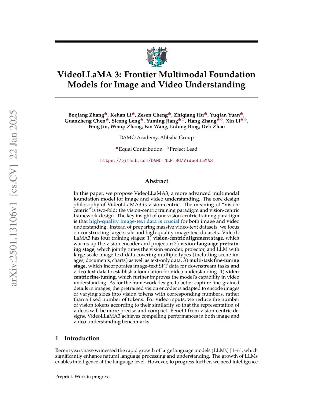 In this paper, we propose VideoLLaMA3, a more advanced multimodal foundation model for image and video understanding. The core design philosophy of VideoLLaMA3 is vision-centric. The meaning of "vision-centric" is two-fold: the vision-centric training paradigm and vision-centric framework design. The key insight of our vision-centric training paradigm is that high-quality image-text data is crucial for both image and video understanding. Instead of preparing massive video-text datasets, we focus on constructing large-scale and high-quality image-text datasets. VideoLLaMA3 has four training stages: 1) Vision Encoder Adaptation, which enables vision encoder to accept images of variable resolutions as input; 2) Vision-Language Alignment, which jointly tunes the vision encoder, projector, and LLM with large-scale image-text data covering multiple types (including scene images, documents, charts) as well as text-only data. 3) Multi-task Fine-tuning, which incorporates image-text SFT data for downstream tasks and video-text data to establish a foundation for video understanding. 4) Video-centric Fine-tuning, which further improves the model's capability in video understanding. As for the framework design, to better capture fine-grained details in images, the pretrained vision encoder is adapted to encode images of varying sizes into vision tokens with corresponding numbers, rather than a fixed number of tokens. For video inputs, we reduce the number of vision tokens according to their similarity so that the representation of videos will be more precise and compact. Benefit from vision-centric designs, VideoLLaMA3 achieves compelling performances in both image and video understanding benchmarks.