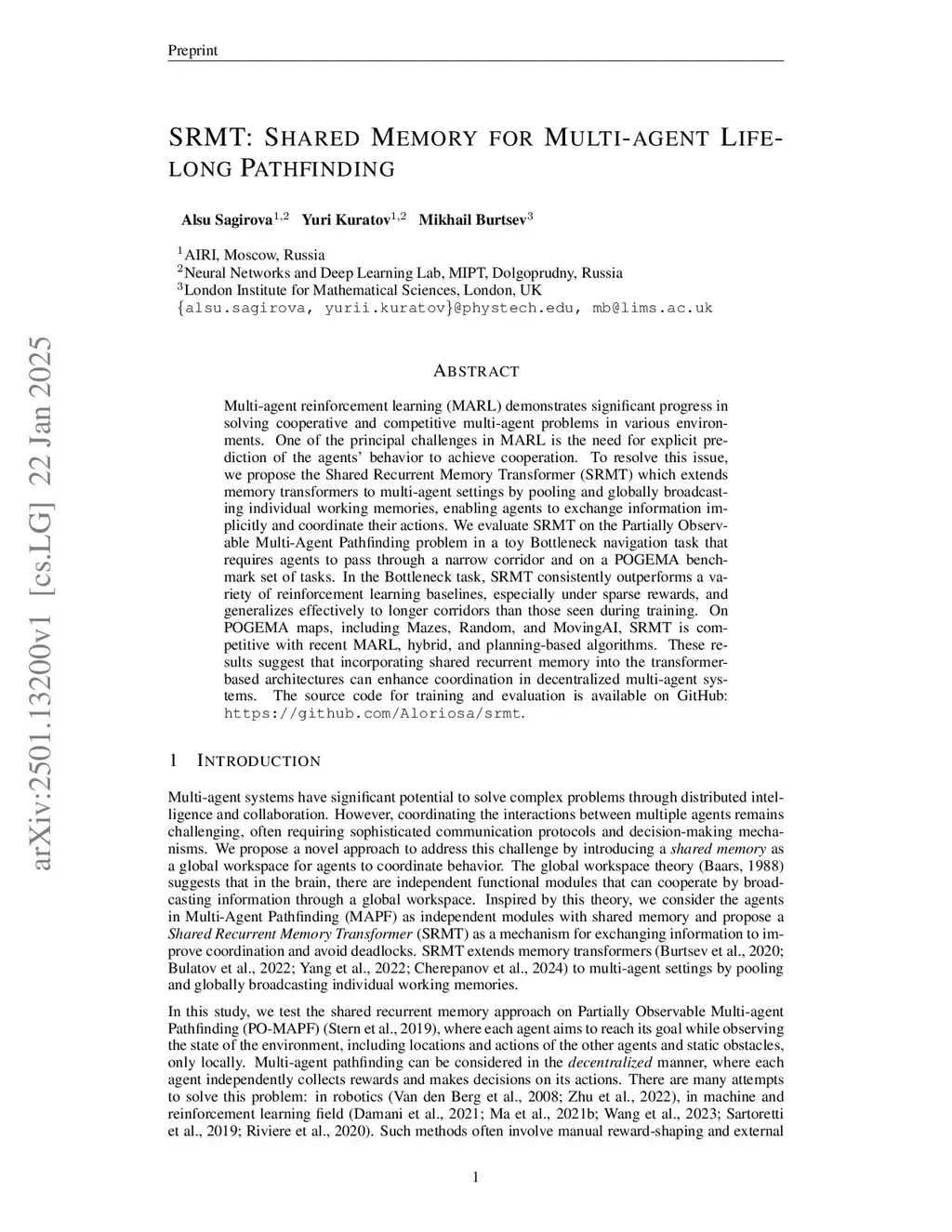 Multi-agent reinforcement learning (MARL) demonstrates significant progress in solving cooperative and competitive multi-agent problems in various environments. One of the principal challenges in MARL is the need for explicit prediction of the agents' behavior to achieve cooperation. To resolve this issue, we propose the Shared Recurrent Memory Transformer (SRMT) which extends memory transformers to multi-agent settings by pooling and globally broadcasting individual working memories, enabling agents to exchange information implicitly and coordinate their actions. We evaluate SRMT on the Partially Observable Multi-Agent Pathfinding problem in a toy Bottleneck navigation task that requires agents to pass through a narrow corridor and on a POGEMA benchmark set of tasks. In the Bottleneck task, SRMT consistently outperforms a variety of reinforcement learning baselines, especially under sparse rewards, and generalizes effectively to longer corridors than those seen during training. On POGEMA maps, including Mazes, Random, and MovingAI, SRMT is competitive with recent MARL, hybrid, and planning-based algorithms. These results suggest that incorporating shared recurrent memory into the transformer-based architectures can enhance coordination in decentralized multi-agent systems. The source code for training and evaluation is available on GitHub:this https URL.