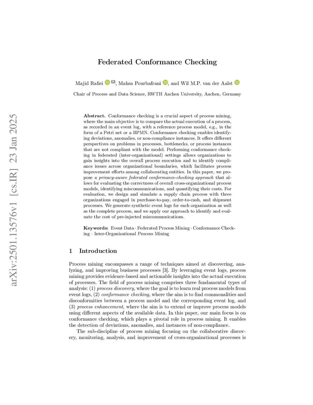 Conformance checking is a crucial aspect of process mining, where the main objective is to compare the actual execution of a process, as recorded in an event log, with a reference process model, e.g., in the form of a Petri net or a BPMN. Conformance checking enables identifying deviations, anomalies, or non-compliance instances. It offers different perspectives on problems in processes, bottlenecks, or process instances that are not compliant with the model. Performing conformance checking in federated (inter-organizational) settings allows organizations to gain insights into the overall process execution and to identify compliance issues across organizational boundaries, which facilitates process improvement efforts among collaborating entities. In this paper, we propose a privacy-aware federated conformance-checking approach that allows for evaluating the correctness of overall cross-organizational process models, identifying miscommunications, and quantifying their costs. For evaluation, we design and simulate a supply chain process with three organizations engaged in purchase-to-pay, order-to-cash, and shipment processes. We generate synthetic event logs for each organization as well as the complete process, and we apply our approach to identify and evaluate the cost of pre-injected miscommunications.