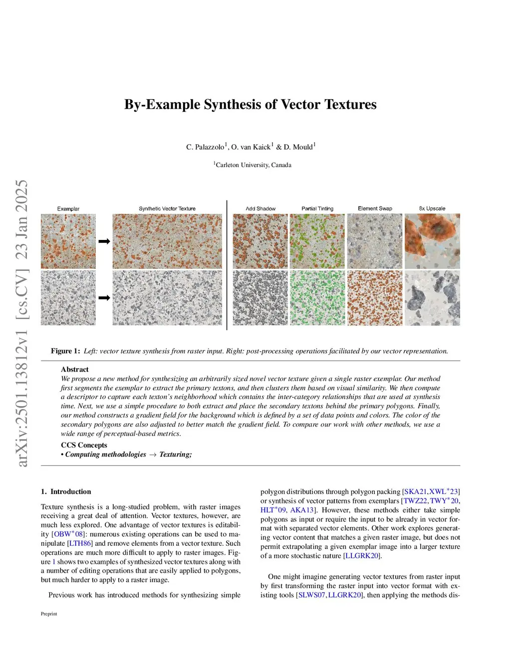 We propose a new method for synthesizing an arbitrarily sized novel vector texture given a single raster exemplar. Our method first segments the exemplar to extract the primary textons, and then clusters them based on visual similarity. We then compute a descriptor to capture each texton's neighborhood which contains the inter-category relationships that are used at synthesis time. Next, we use a simple procedure to both extract and place the secondary textons behind the primary polygons. Finally, our method constructs a gradient field for the background which is defined by a set of data points and colors. The color of the secondary polygons are also adjusted to better match the gradient field. To compare our work with other methods, we use a wide range of perceptual-based metrics.