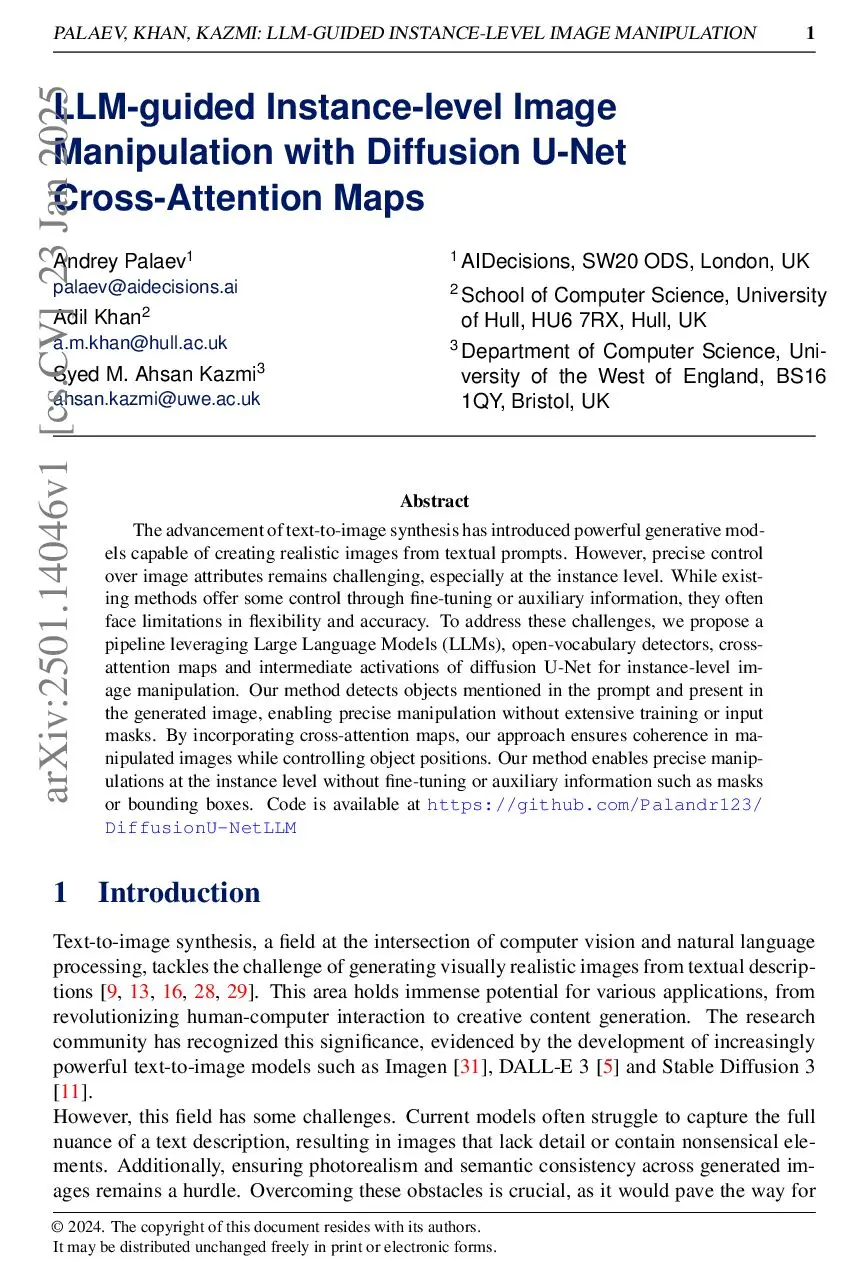 LLM-guided Instance-level Image Manipulation with Diffusion U-Net Cross-Attention Maps