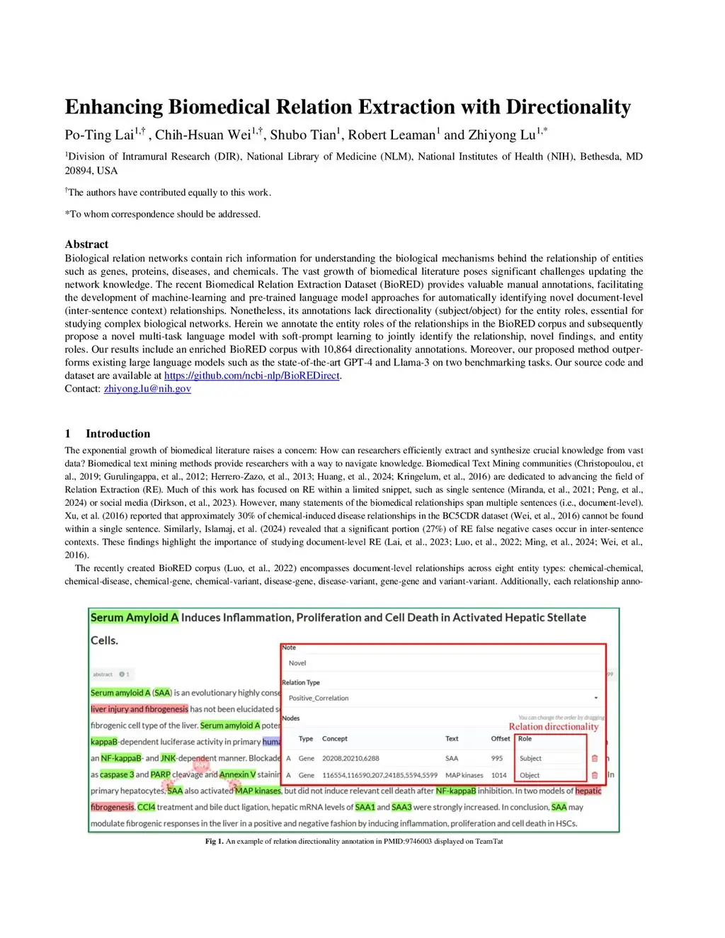 Biological relation networks contain rich information for understanding the biological mechanisms behind the relationship of entities such as genes, proteins, diseases, and chemicals. The vast growth of biomedical literature poses significant challenges updating the network knowledge. The recent Biomedical Relation Extraction Dataset (BioRED) provides valuable manual annotations, facilitating the develop-ment of machine-learning and pre-trained language model approaches for automatically identifying novel document-level (inter-sentence context) relationships. Nonetheless, its annotations lack directionality (subject/object) for the entity roles, essential for studying complex biological networks. Herein we annotate the entity roles of the relationships in the BioRED corpus and subsequently propose a novel multi-task language model with soft-prompt learning to jointly identify the relationship, novel findings, and entity roles. Our results in-clude an enriched BioRED corpus with 10,864 directionality annotations. Moreover, our proposed method outperforms existing large language models such as the state-of-the-art GPT-4 and Llama-3 on two benchmarking tasks. Our source code and dataset are available atthis https URL.