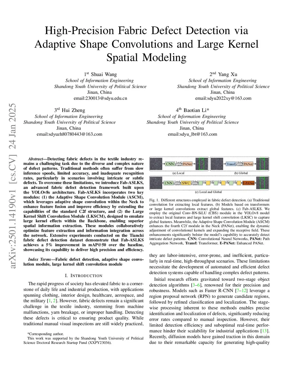 High-Precision Fabric Defect Detection via Adaptive Shape Convolutions and Large Kernel Spatial Modeling